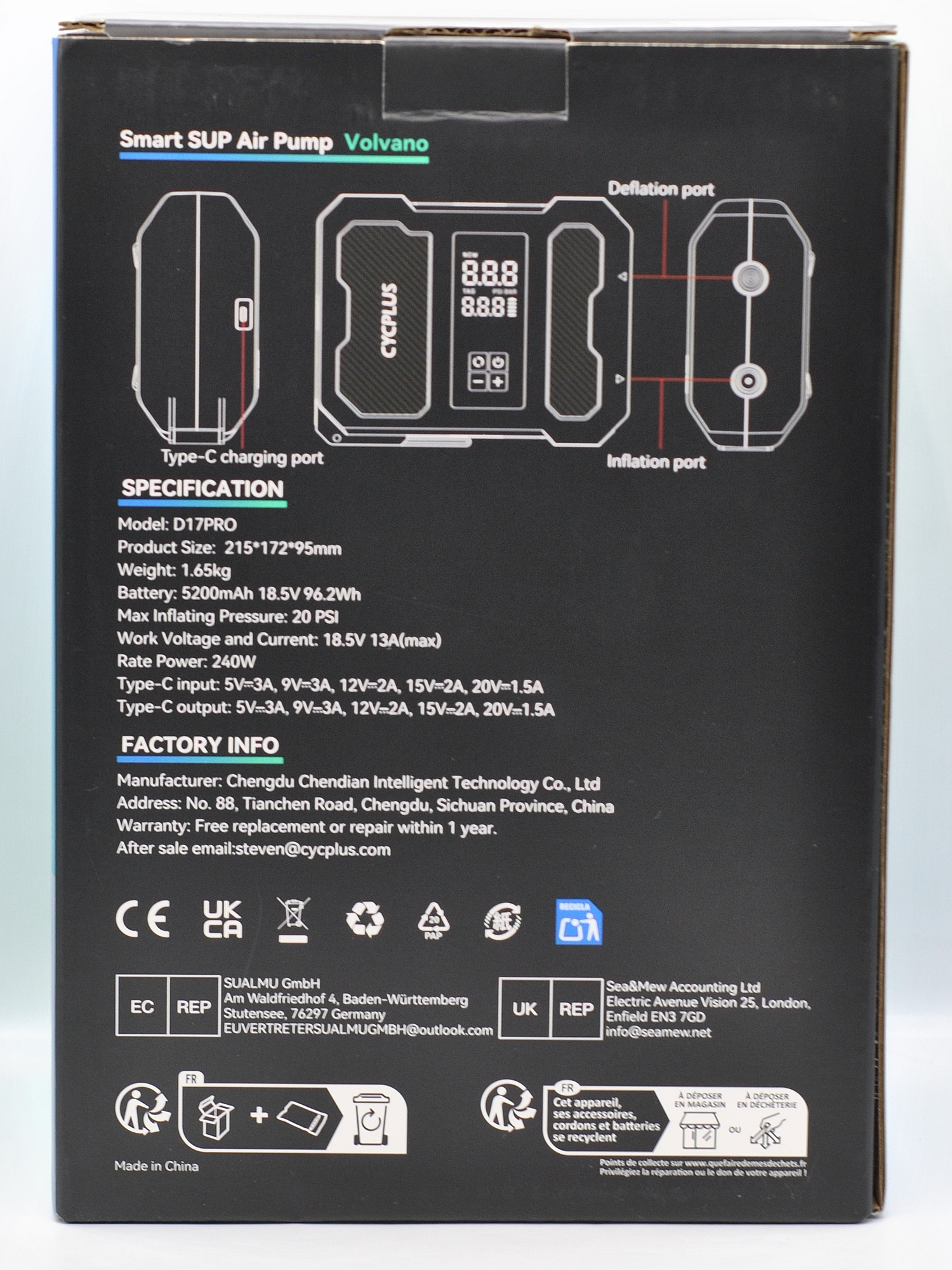 Насос CycPlus D17 Pro демонстрирует выдающиеся характеристики как в плане производительности, так и в плане универсальности применения (не только для SUP-бордистов, но и для владельцев надувных лодок, каяков и других надувных изделий). Автоматический режим работы сам подберет нужную производительность в зависимости от нужного давления. Наличие крупного LED-экрана, режима повербанка (33 Вт PD), удобной ручки для переноски и гермомешка делает использование этого насоса максимально комфортным.
