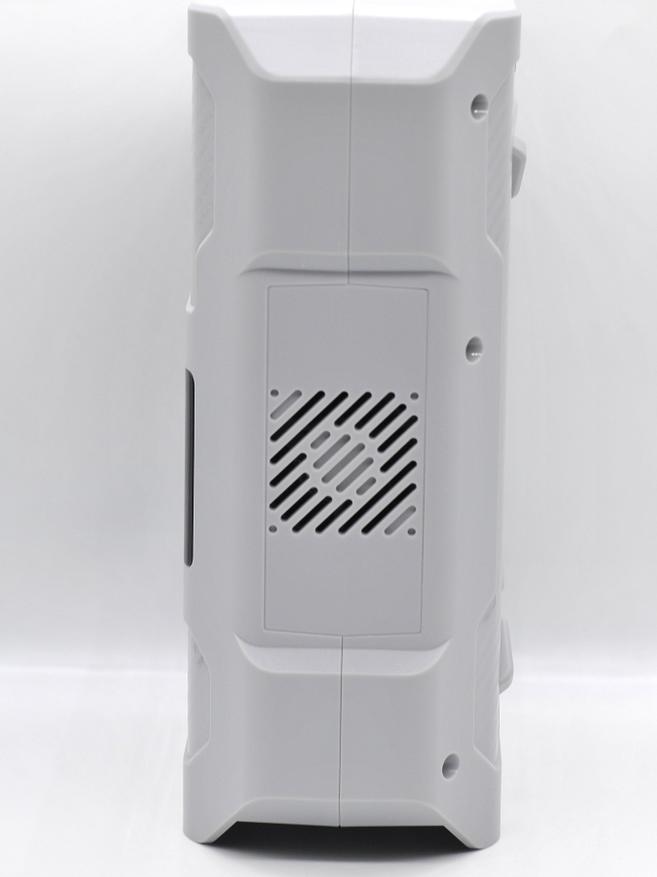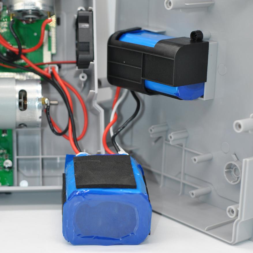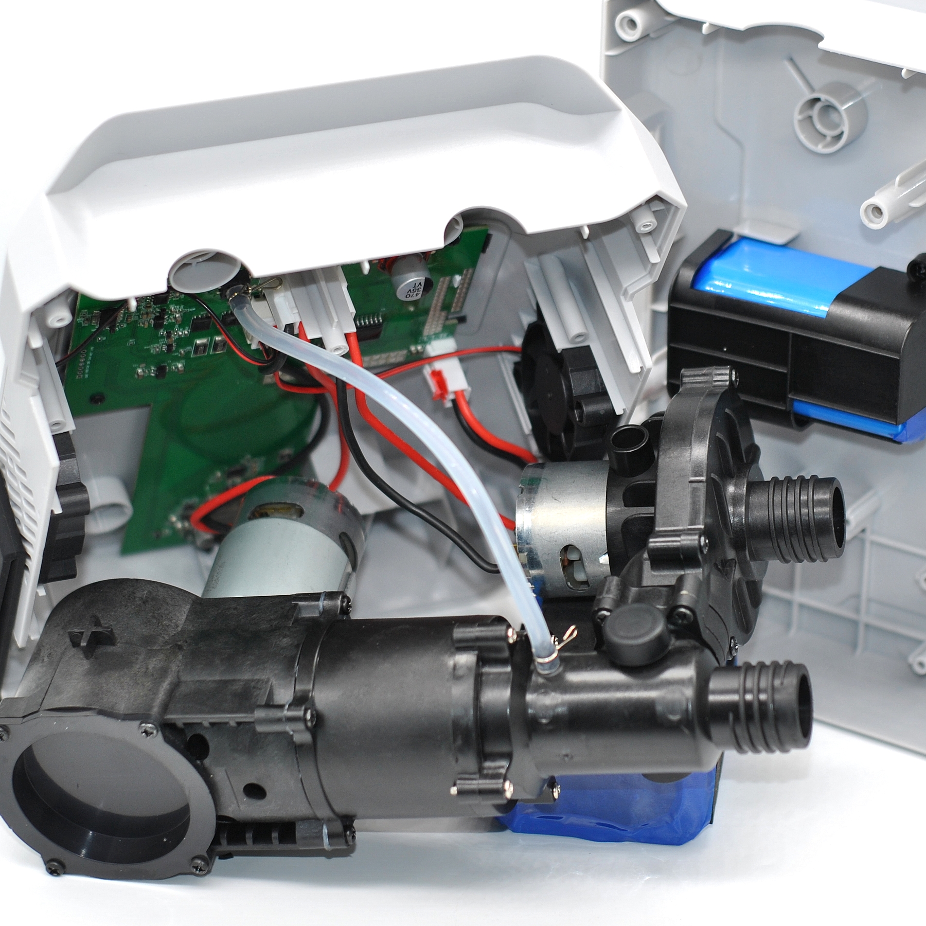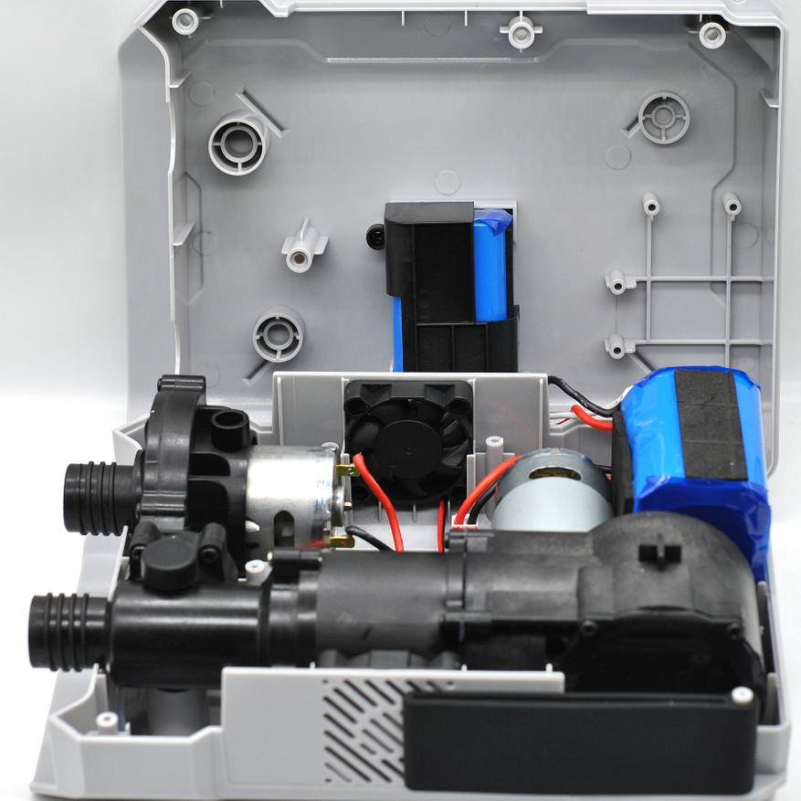 Сама насосная часть тут крупнее (а значит производительнее) других насосов бренда, в обеих ступенях стоят коллекторные двигатели (555-й размер, 20 В). В корпус нагнетают воздух (для первой ступени и охлаждения) два вентилятора с каждой стороны. Печатная плата обильно залита лаком. Аккумуляторная батарея разделена на две сборки, всего используется 10 элементов 18650 по схеме 5S2P.