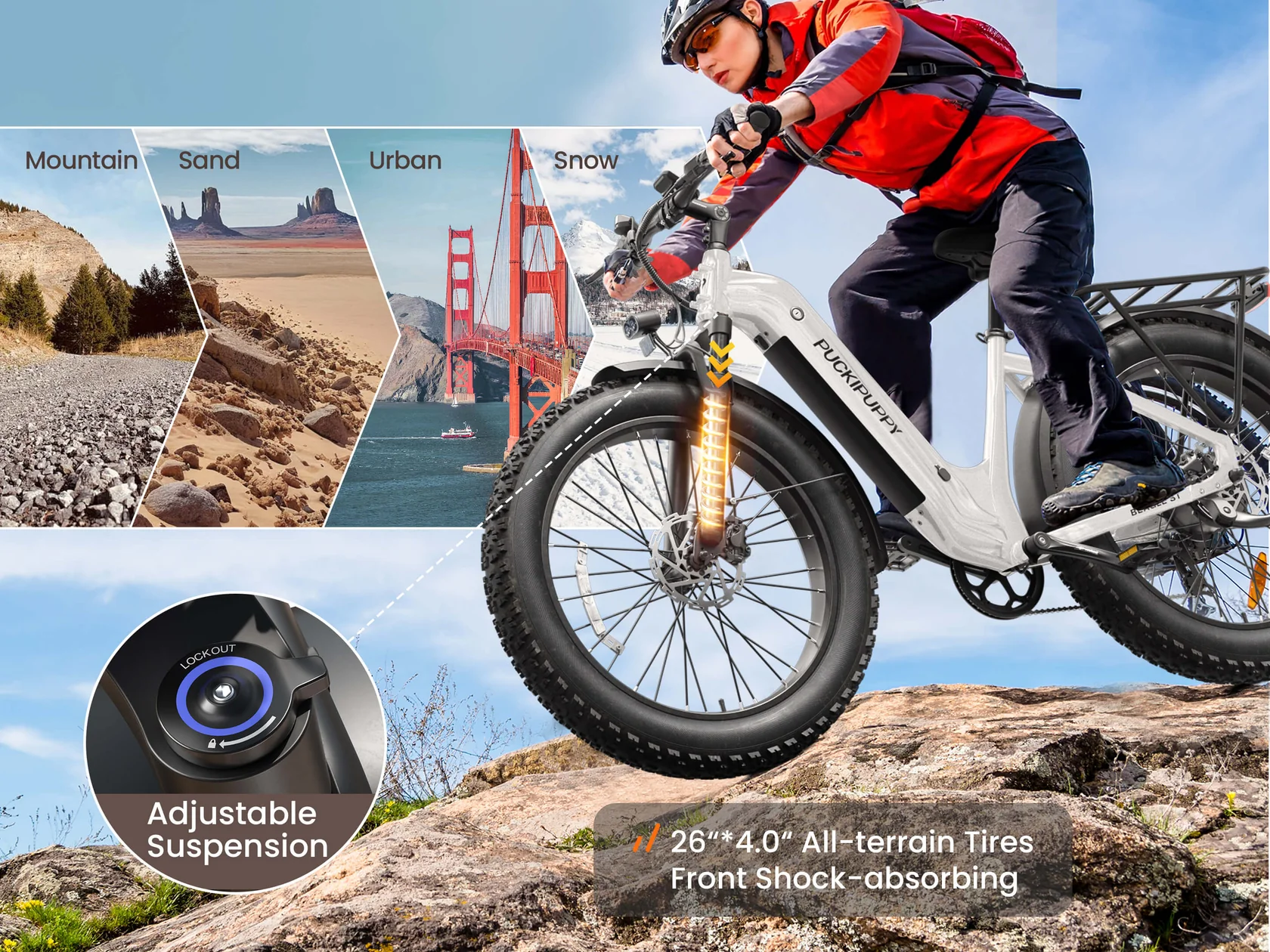 Вилка дает передней подвеске ход 110 мм и способна смягчать удары во время езды. В состав оборудования входят дисковые гидравлические тормоза и трансмиссия Shimano 7 скоростей. Видимость в темноте обеспечивает передняя фара. Толстые шины размером 26 * 4 дюйма обеспечивают комфорт и сцепление с дорогой на ухабистой и пересеченной местности.