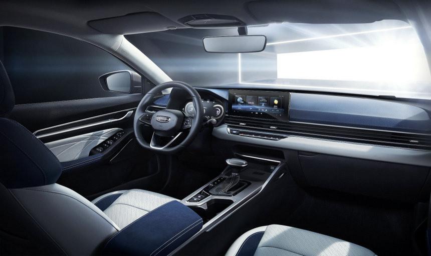Габариты Emgrand: 4638*1820*1420, колесная база 2650мм. Приобрная панель имеет 12.3" дисплей, мультимедийная система 10.25" дисплей. Запуск двигателя осуществляется по кнопке, есть электронный ручник и люк. Не забыли и про систему кругового обзора авто.