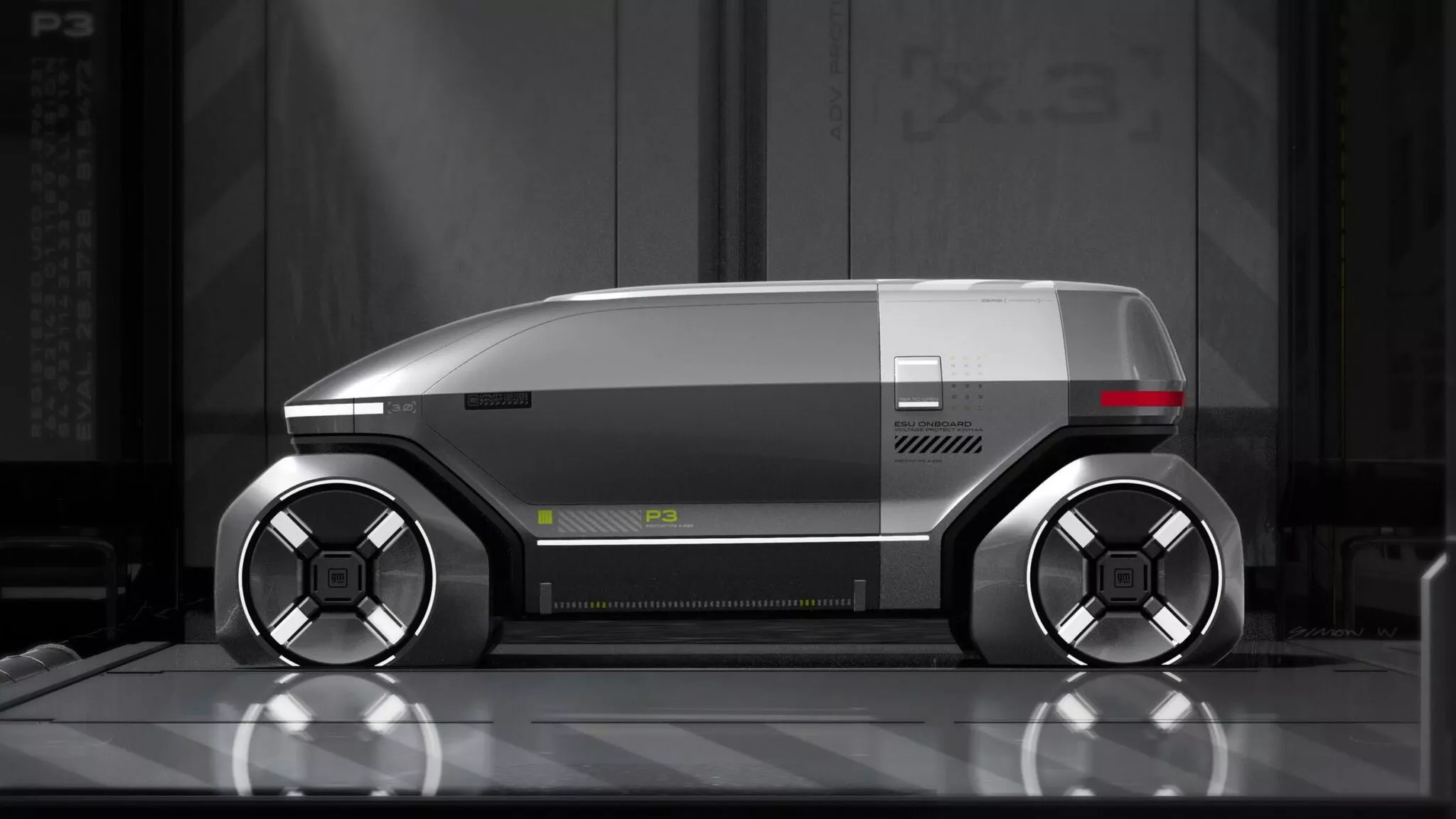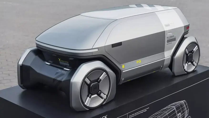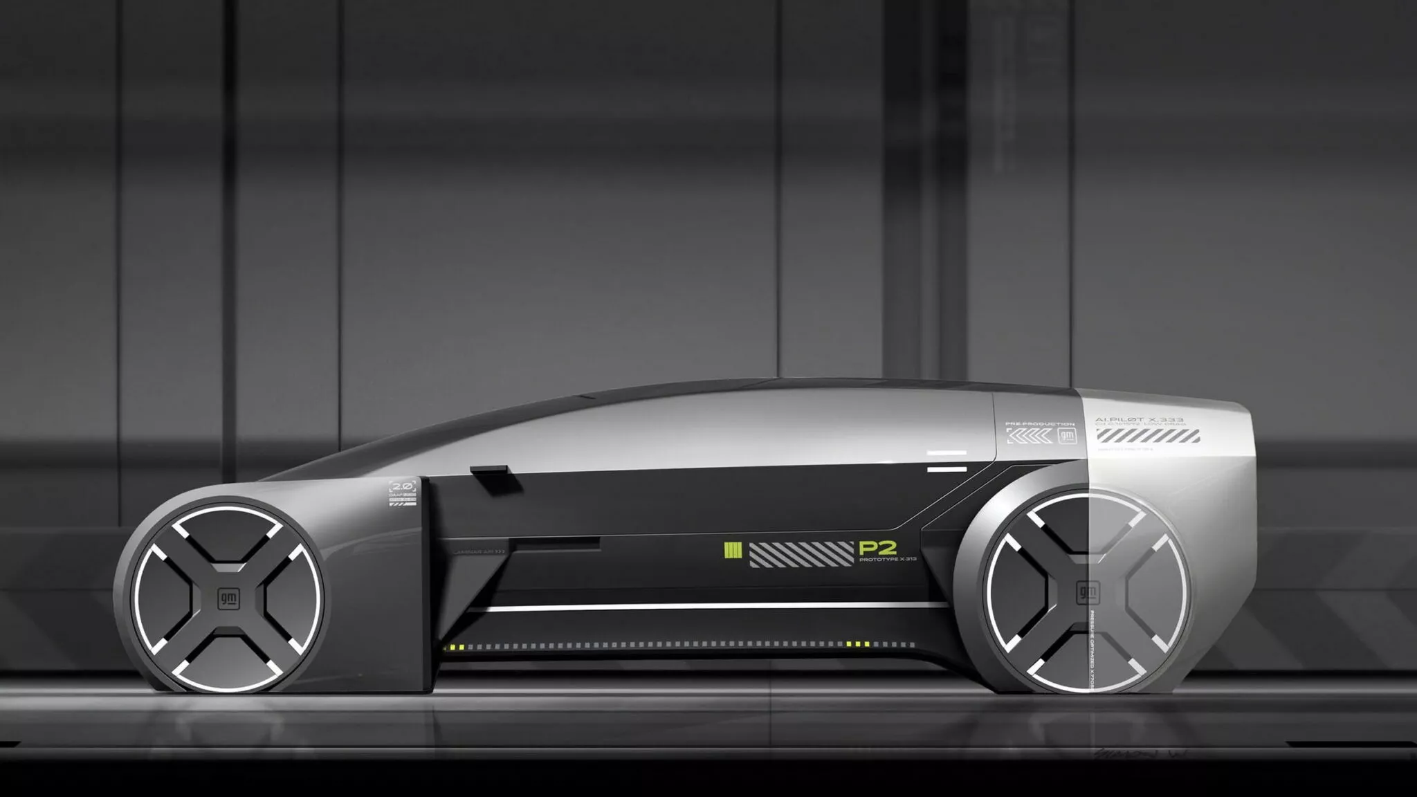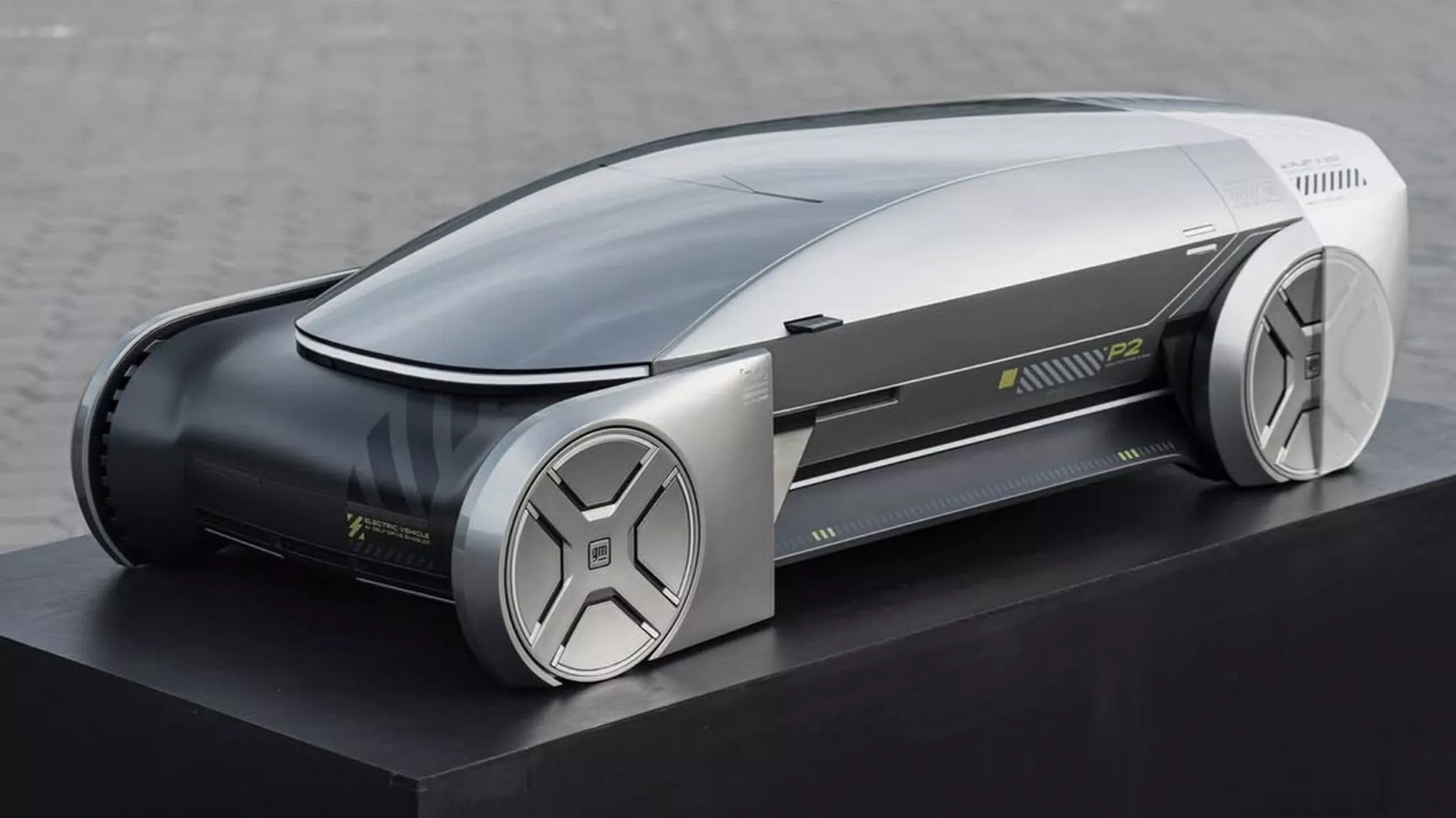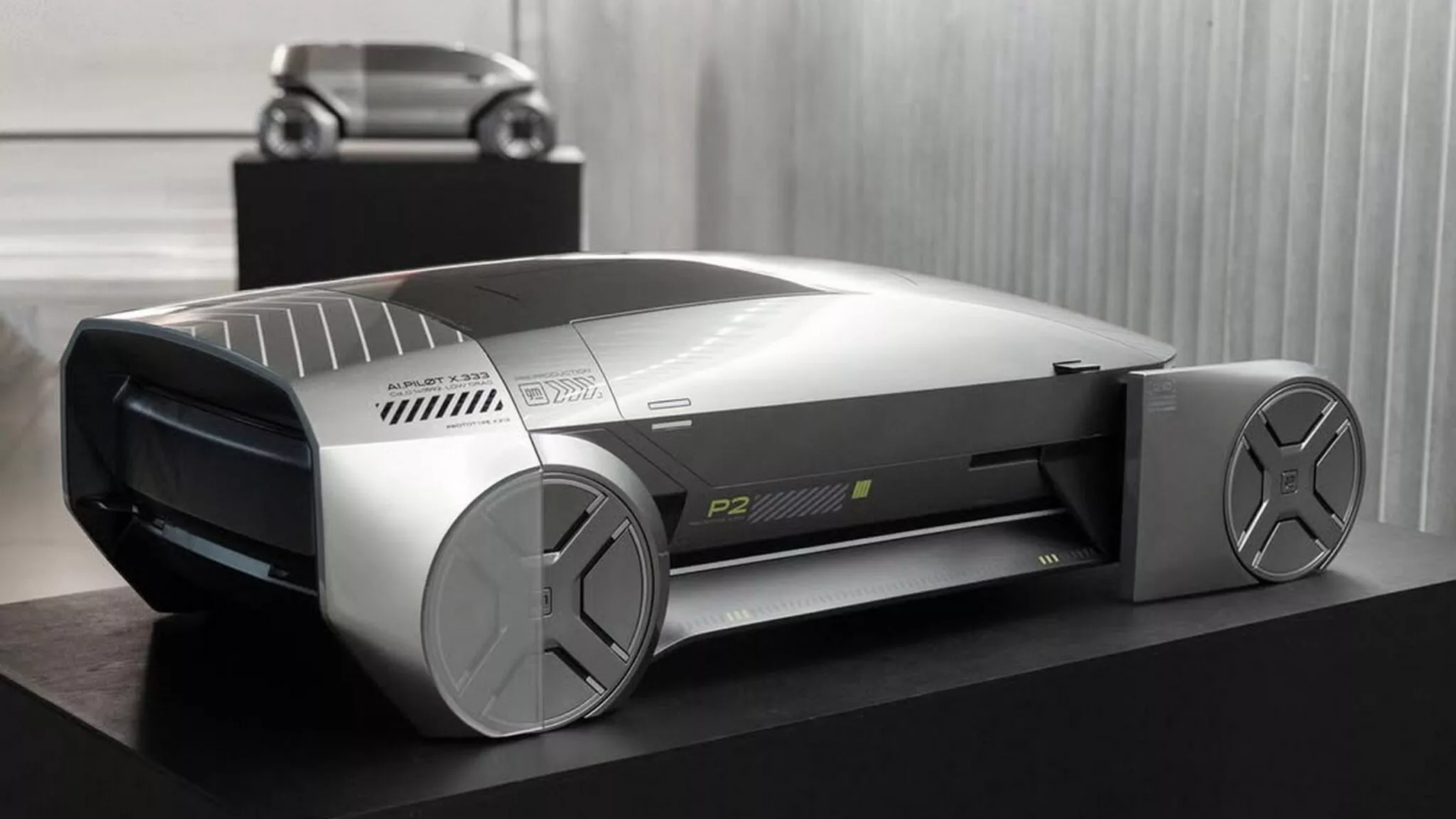 Второй концепт P2 — аэродинамический электромобиль с низкой посадкой, сильно наклоненным лобовым стеклом и плавной линией крыши. Двери автомобиля открываются вверх, а боковые наклейки указывают на наличие системы «ИИ. Пилот», предположительно отвечающей за автономное управление.