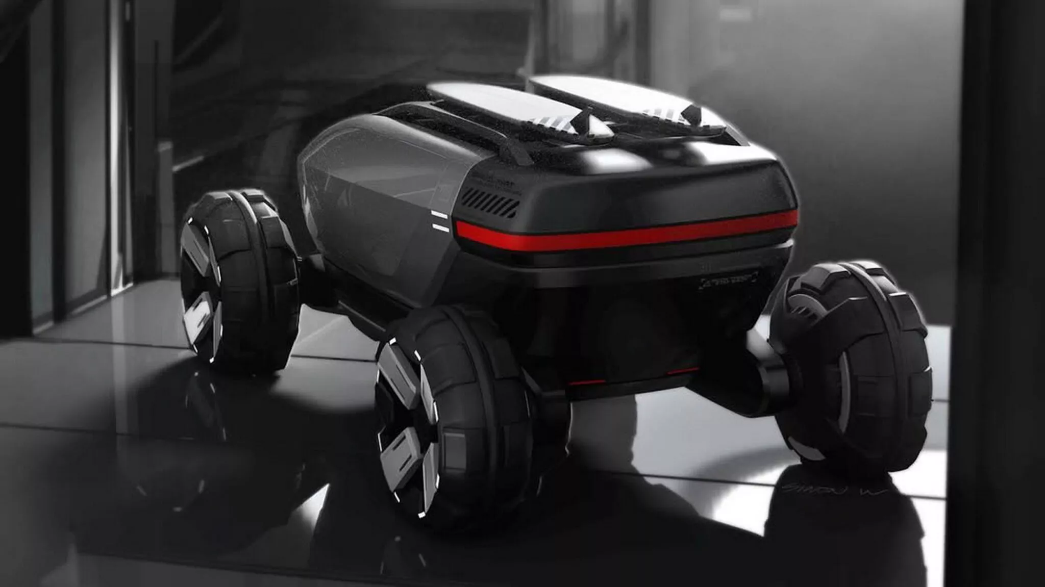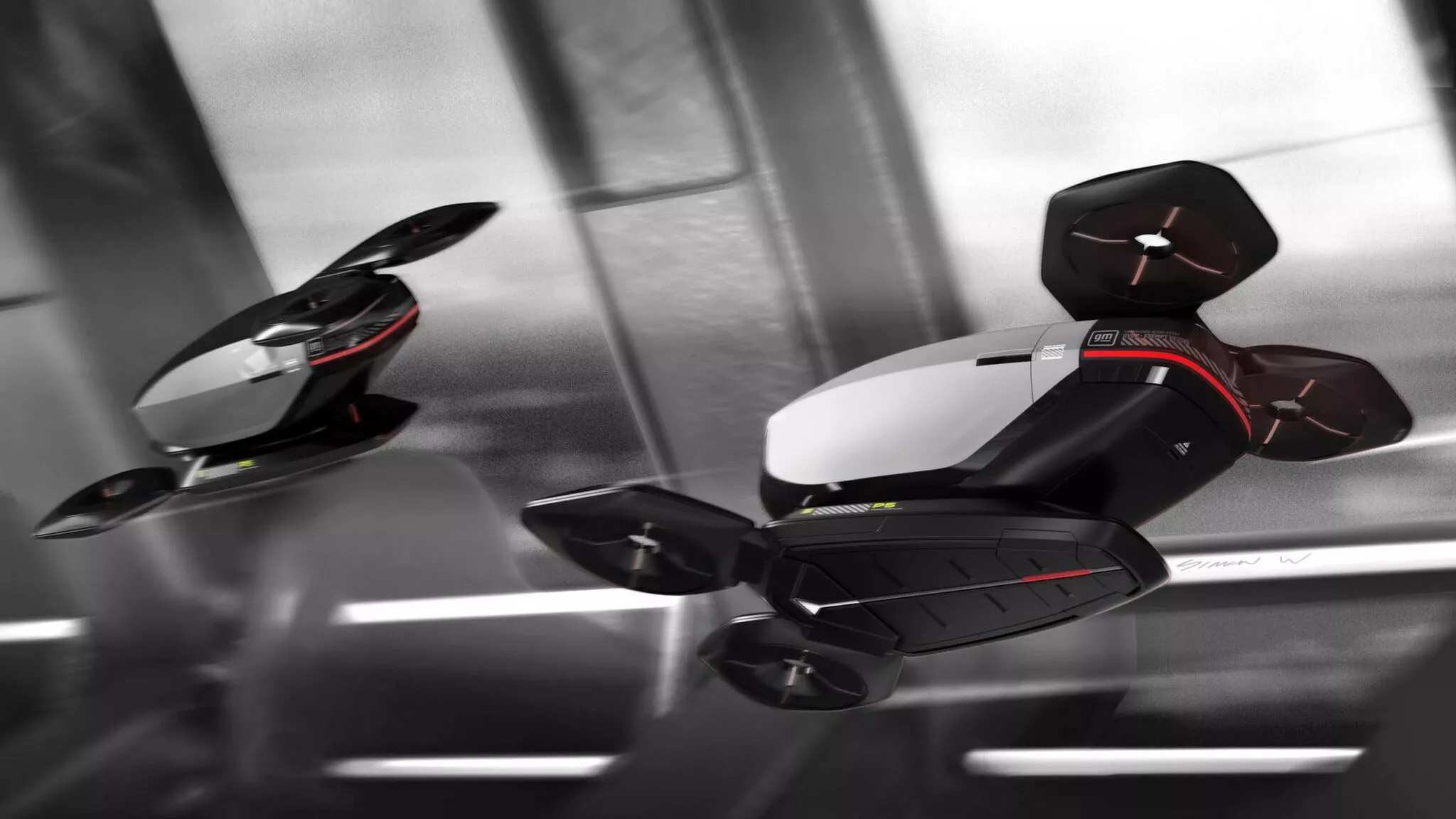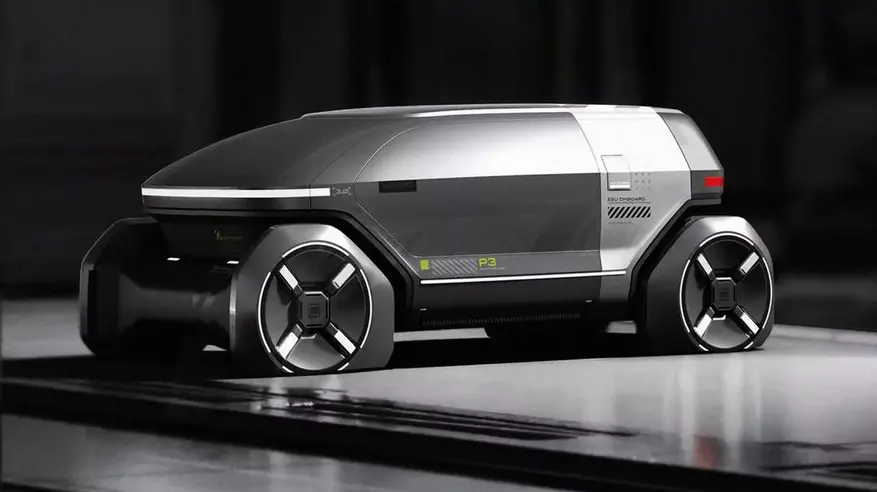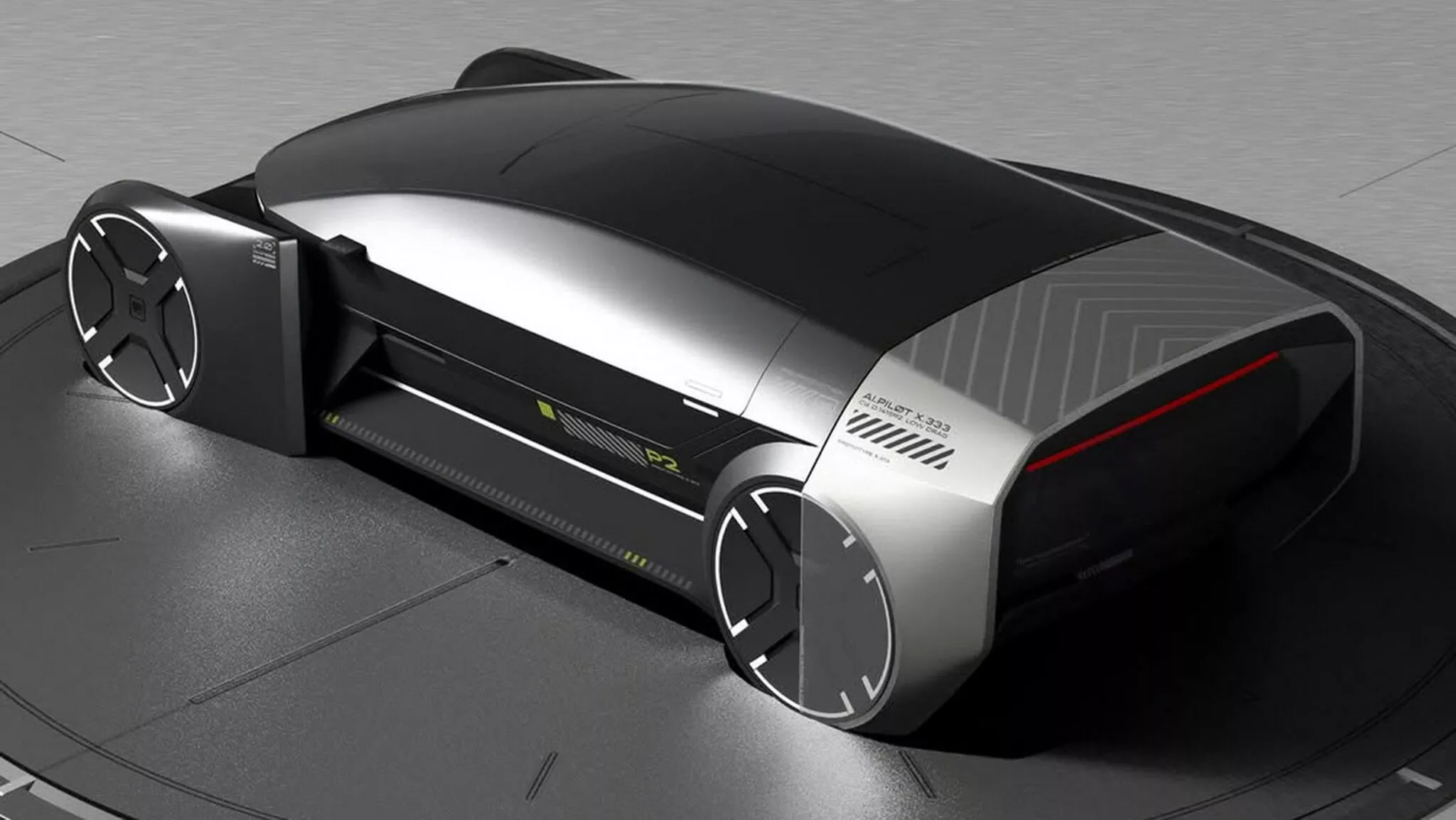 Пятый концепт P5 представляет собой летательный аппарат с вертикальным взлетом и посадкой (VTOL), напоминающий крупный дрон с двумя рядами вентиляторов и плоским дном.