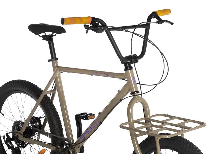 Мягко говоря необычно выглядит руль. Тут привлекает сознательная стилистика BMX, которая в реальности позволит при желании разместить больше всего полезного включая сумки, по сравнению с обычным рулем-палкой. Огромная ширина 760 мм выбрана не просто так, это делает управление менее острым и позволит лучше управлять нагруженным велосипедом. На руле установлены веселые оранжево-желтые грипсы с небольшой амортизацией ладоней.
