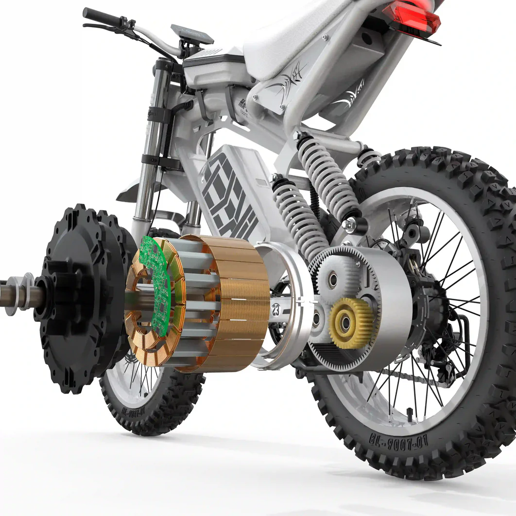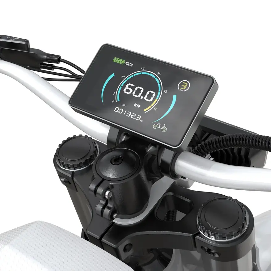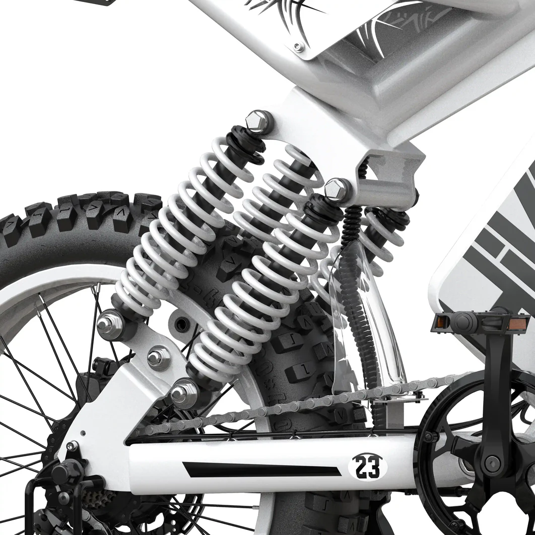 Сцепление с дорогой выполняют толстые шины 20*4 дюйма. Полная подвеска представлена амортизационной вилкой и задней подвеской на 4 пружинах. Имеется освещение: передняя, задний фонарь.