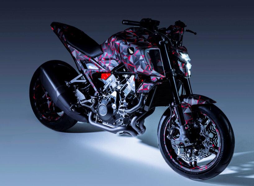 Прототип покрыт камуфляжной пленкой с геометрическим рисунком из красных, черных и серых треугольников. Такая маскировка скрывает окончательные линии кузова и затрудняет определение финальной формы панелей. На топливном баке размещена новая эмблема Honda Flagship WING, предназначенная для премиальных моделей марки начиная с 2026 года.
