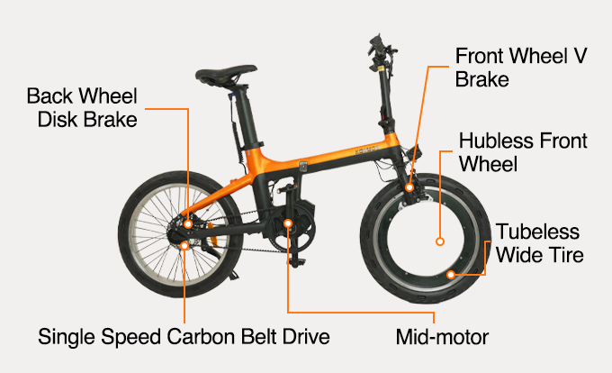Обе модели построены на алюминиевой (сплав 6061) складной раме, ориентировочная масса 22 кг. Покрышки с защитой от прокола (без необходимости накачки) размерности 22x3″. Передние тормоза ободные механические, задние дисковые гидравлические.