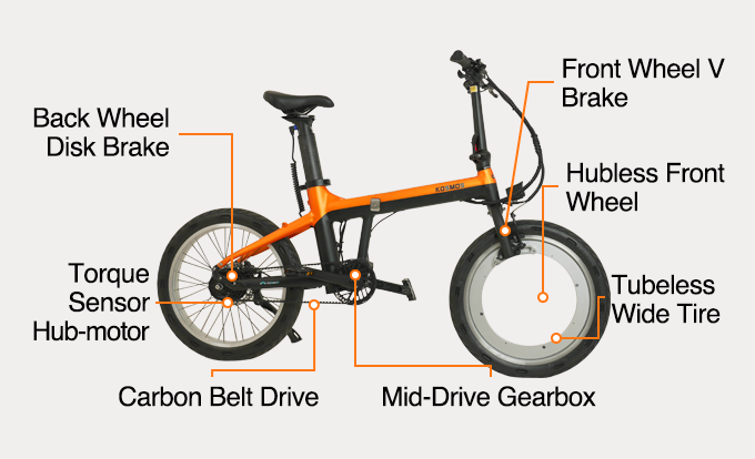 Персональный электротранспорт на пике популярности и для борьбы на этом рынке компании стараются выделиться на фоне конкурентов. Стартап из Южной Кореи Kosmos представил свой вариант городского складного электровелосипеда. Упор в дизайне сделан на безвтулочное колесо (только переднее), а из оснащения выделяется центральная пяти скоростная механическая коробка скоростей и ременная трансмиссия. Модель выпускается в двух вариантах с разным типом электромоторов (но каждый мощностью по 250 Вт) и трансмиссией.