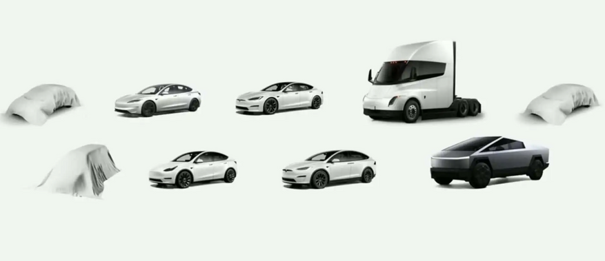 На слайде были изображены три новых автомобиля, которые стояли рядом с существующими моделями Tesla: Model 3, Model Y, Model S, Model X, Cybertruck и Semi. Два из них имели гладкие и похожие на автомобили очертания. Ожидается, что третий автомобиль будет представлять собой микроавтобус с кабиной, что может значительно изменить бренд.