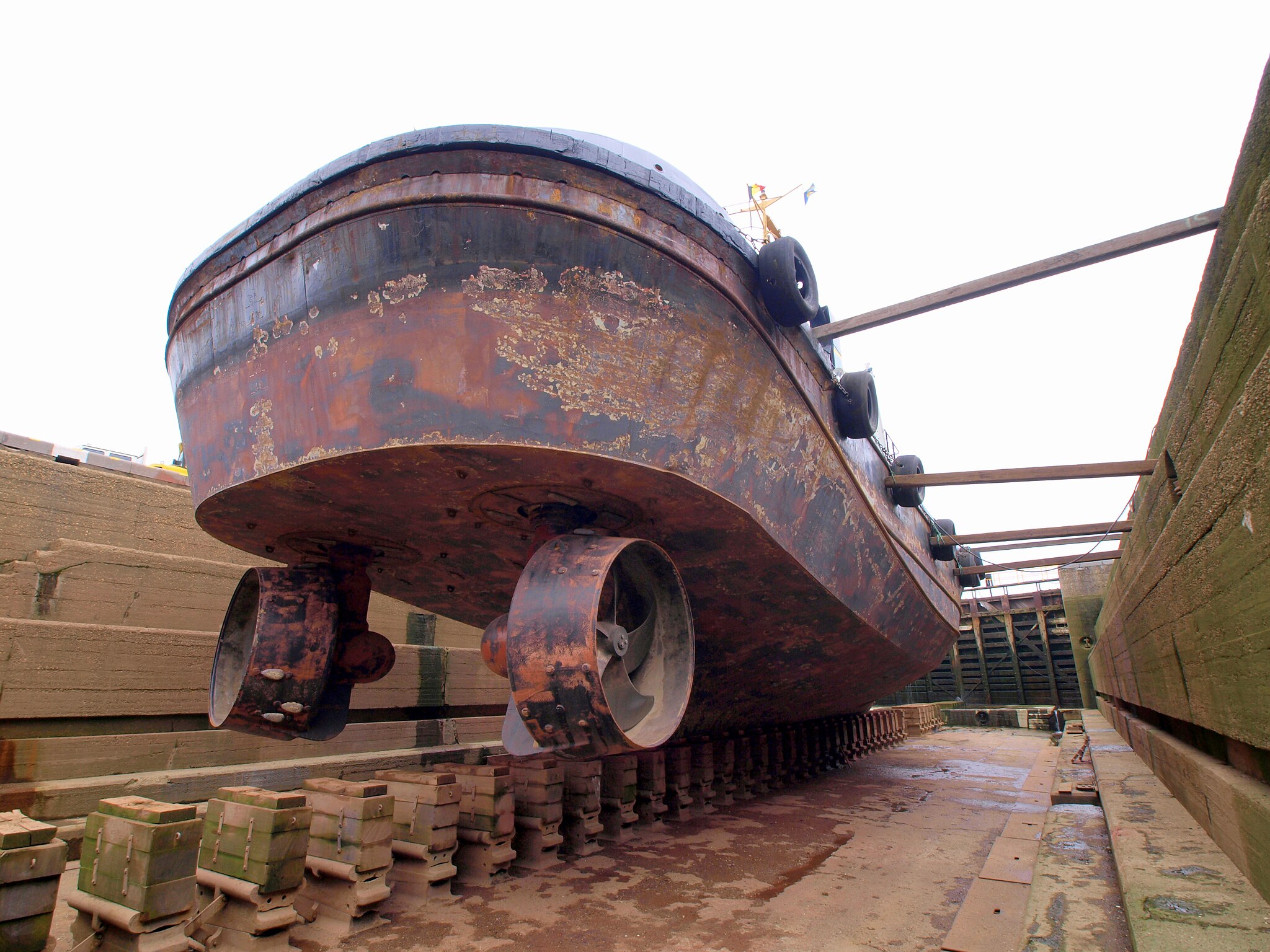 - Во-вторых, его движители. Чтобы этой силой можно было ювелирно управлять, у буксиров давно уже не обычные винты. Там стоят хитрые системы, которые могут направлять тягу практически в любую сторону. Иногда это азимутальные установки — поворотные колонки с винтами, которые вращаются на 360 градусов. А иногда — еще более экзотические штуки, как на фото ниже.