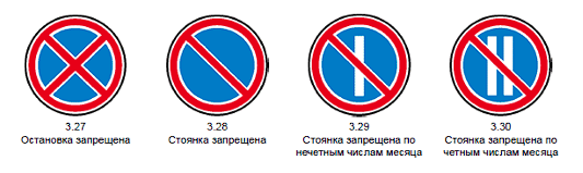 Когда не тратишь время на теорию, вопросы становятся несколько сложнее. Этот билет — отличное тому доказательство. Перед нами знак 3.29. — он запрещает стоянку по нечетным числам месяца. Вообще, вся группа знаков 3.27. — 3.30. очень похожа друг на друга. Взглянем на них: