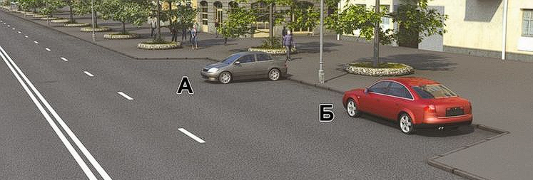 Перед нами дорога с «карманом» (местное уширение проезжей части). Как мы видим, на нем два автомобиля, которые по условиям задачи совершают стоянку. Серенькая машина стоит привычным способом и обозначена буквой «А», а вот красненький автомобиль стоит параллельно, и обозначается буквой «Б».