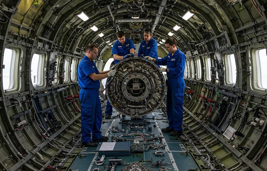 Что касается «Техосмотра В», некогда более распространенной, то сегодня эта процедура во многом интегрирована в расширенные проверки «Техосмотра А» или заменена другими видами ТО. Ранее «Техосмотр В» выполнялся каждые 4-6 месяцев, занимал целый день и требовал около 150 человеко-часов. Далее следуют более сложные виды технического обслуживания, так называемые «тяжелые» формы. Например, проверка «Техосмотр С» проводится каждые 18-24 месяца, и это уже очень серьезная процедура. Она может длиться до трех недель, а ее трудоемкость достигает почти 6000 человеко-часов. При этом самолет практически полностью разбирают и досконально инспектируют — в буквальном смысле «от носа до хвоста».
