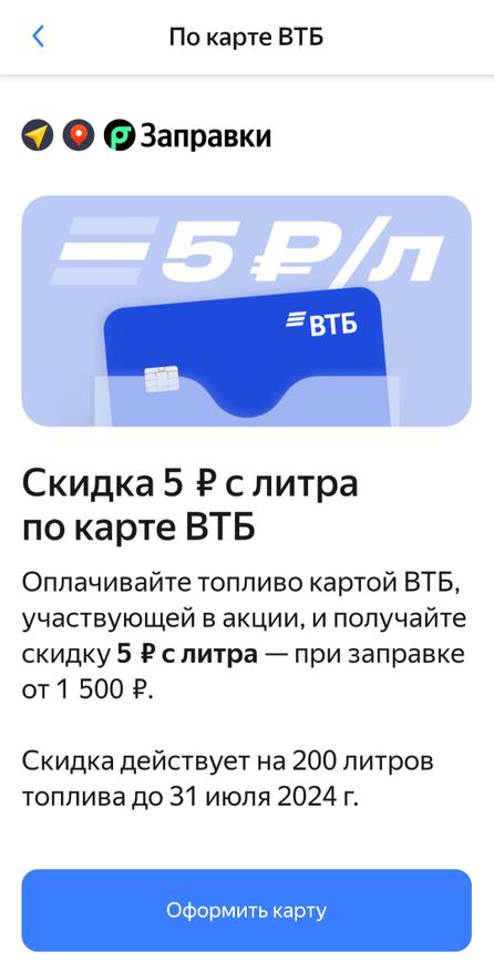 Совсем недавно я писал о совместной акции НСПК и АЗС «Газпромнефть» — при оплате топлива (любого жидкого — кроме электричества) на сумму от 1500 рублей через СБП возвращается кэшбек 7% от размера транзакции. Сразу же упомянул, что это не единственный существующий способ сэкономить сейчас на топливе. Во-первых, по картам некоторых банков на заправках кэшбек может быть не меньшим, а то и большим, причём на постоянной основе. Во-вторых, есть уже свои заправочные сервисы и в приложениях некоторых банков — со своими скидками. Мне, например, экс-«Тинькофф» за своё «Тинькофф Топливо» давал в мае целых 14% кэшбека. В июне, правда, урезал до 7%, а июль… впрочем, это отдельная тема — предложения от нескольких банков будем традиционно сравнивать через пару дней. В-третьих, акции проводят и другие сервисы и/или банки. В частности, до конца июля есть интересное совместное предложение «Яндекс Заправок» и банка ВТБ — скидка 5 рублей с литра при оплате на сумму от (тех же) 1500 рублей, но не более, чем на 200 литров за весь период акции.