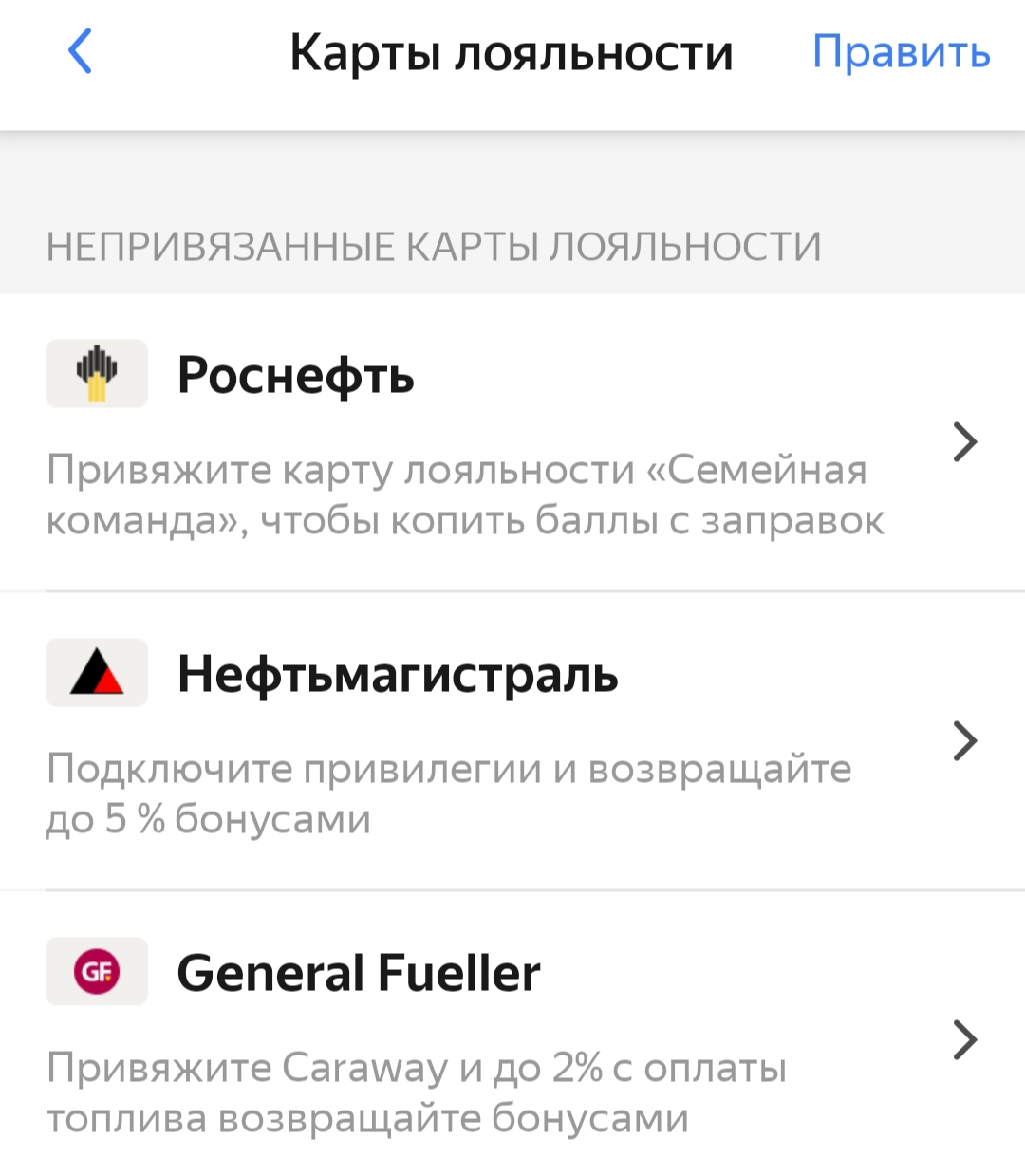 Причём использование «Яндекса» не исключает работу собственных программ лояльности «Роснефти», «Нефтьмагистрали» или General Fueller. Их карточки просто привязать нужно и всё.