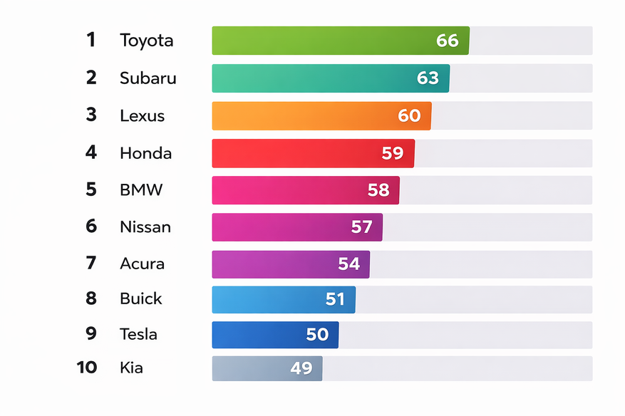 На первой строчке расположилась Toyota, на второй — Subaru, третье место занял Lexus. Honda и BMW замыкают пятерку лидеров. Внизу рейтинга расположились Jeep с 28 баллами, Ram набрал 24 и Rivian — 18.