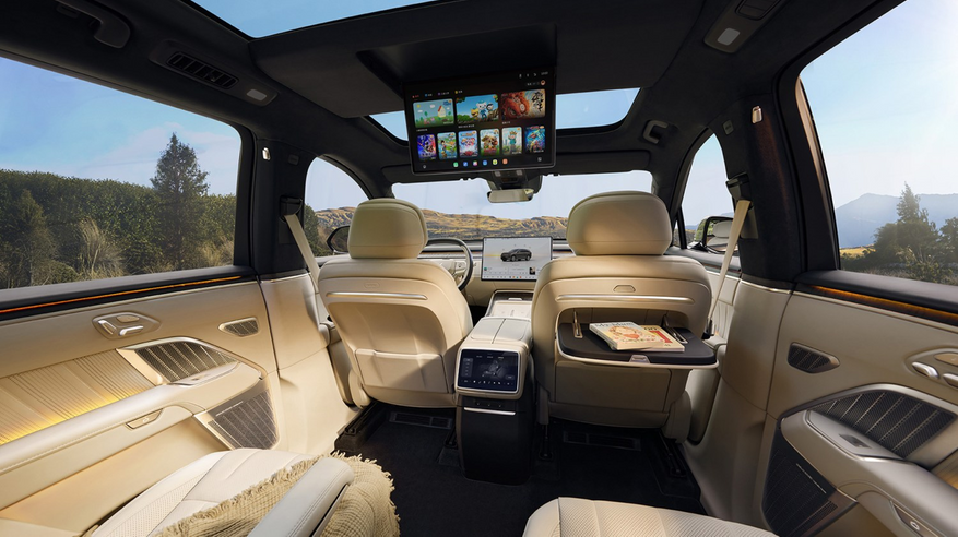 Электрический внедорожник предлагается в шести- и семиместных конфигурациях. В салоне установлен 17,2-дюймовый центральный экран информационно-развлекательной системы. Стандартное оснащение включает трехзонный климат-контроль, сиденья с массажем, подогревом и вентиляцией для всех рядов, а также опциональный развлекательный экран для пассажиров второго ряда. Модель также оснащена встроенным холодильником.
