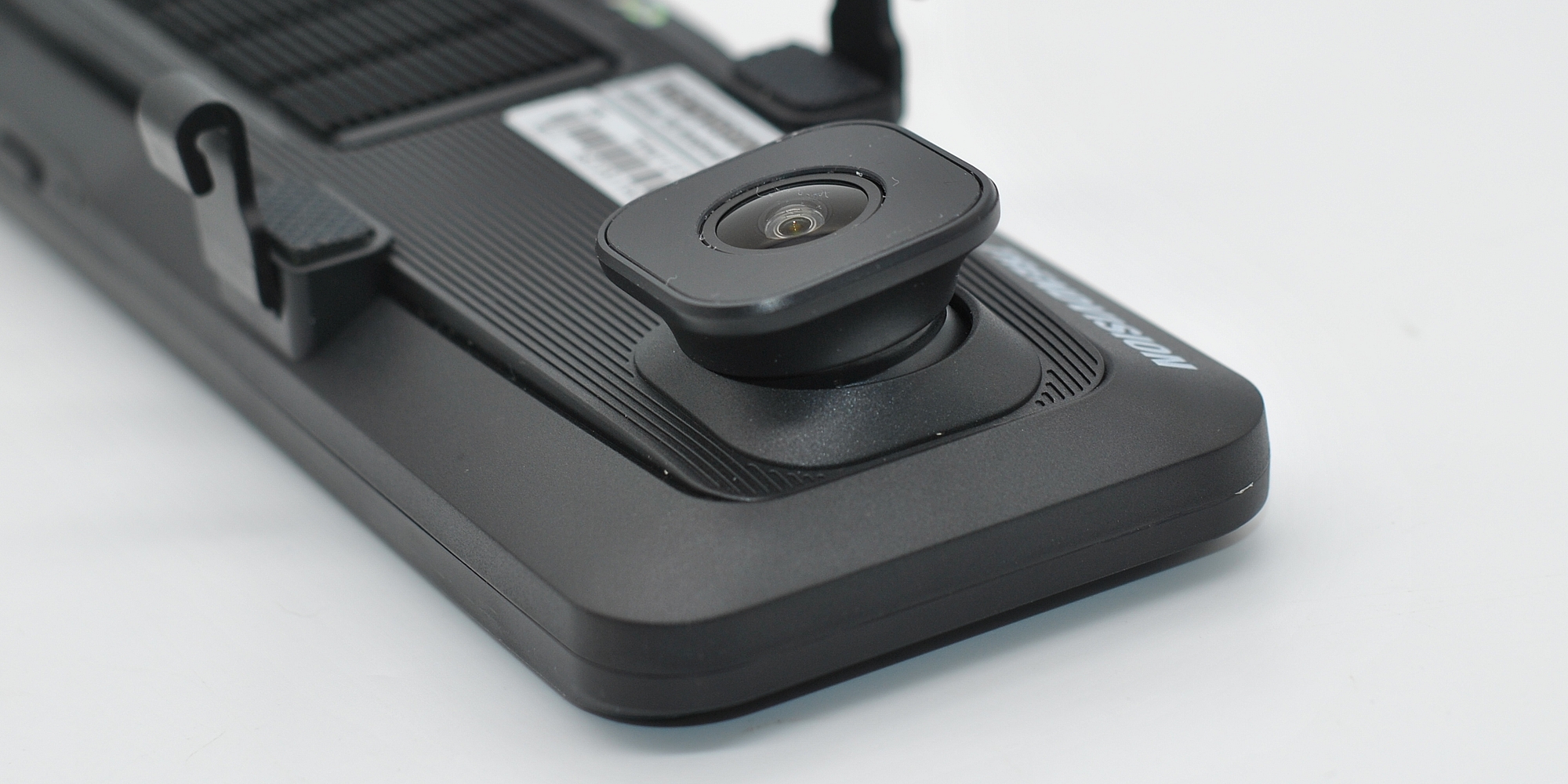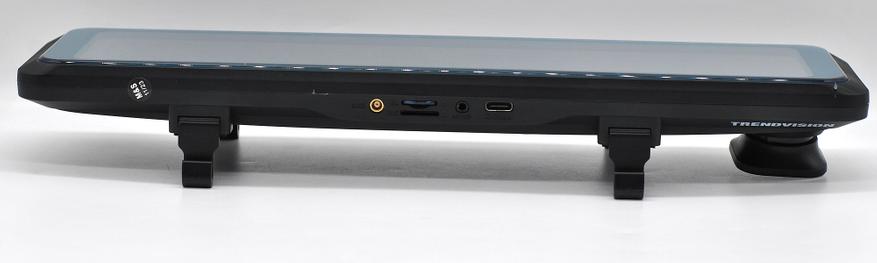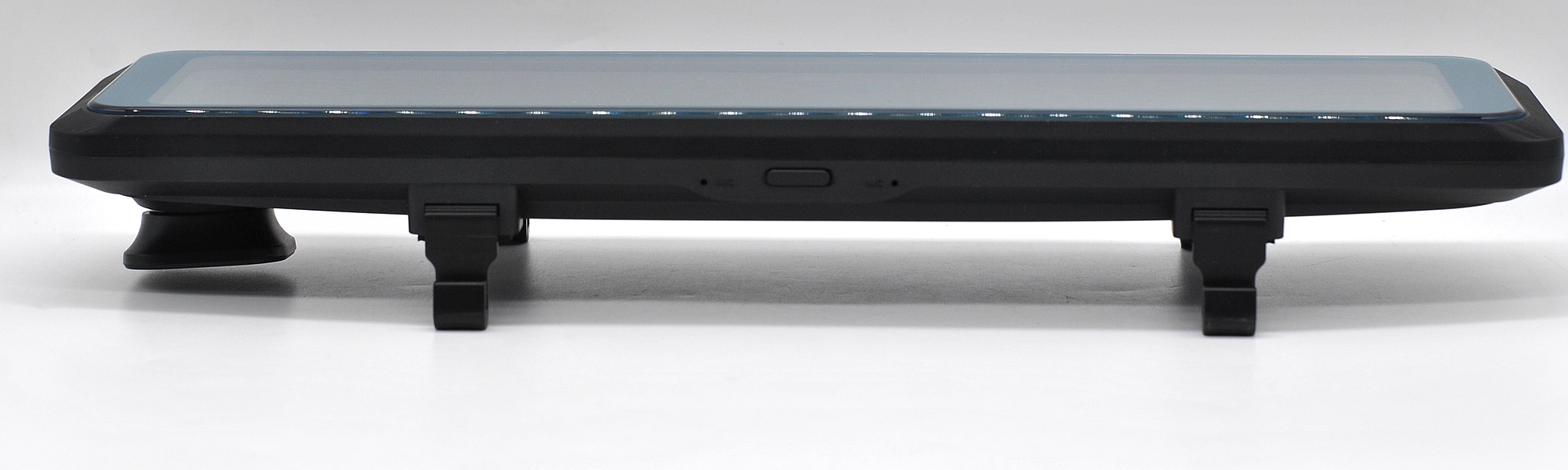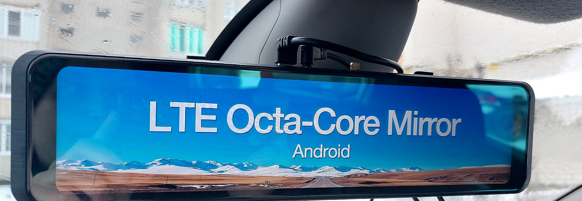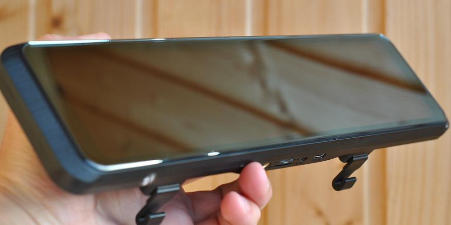 У модели типовая конструкция для такого форм-фактора, крепление идет к штатному зеркалу стяжками, само зеркало не повреждается из-за резиновых накладок. Передняя часть традиционно с зеркальным эффектом. Видимый размер экрана: 25х6 см. Объектив фронтальной камеры вынесен на поворотном в двух направлениях кронштейне.