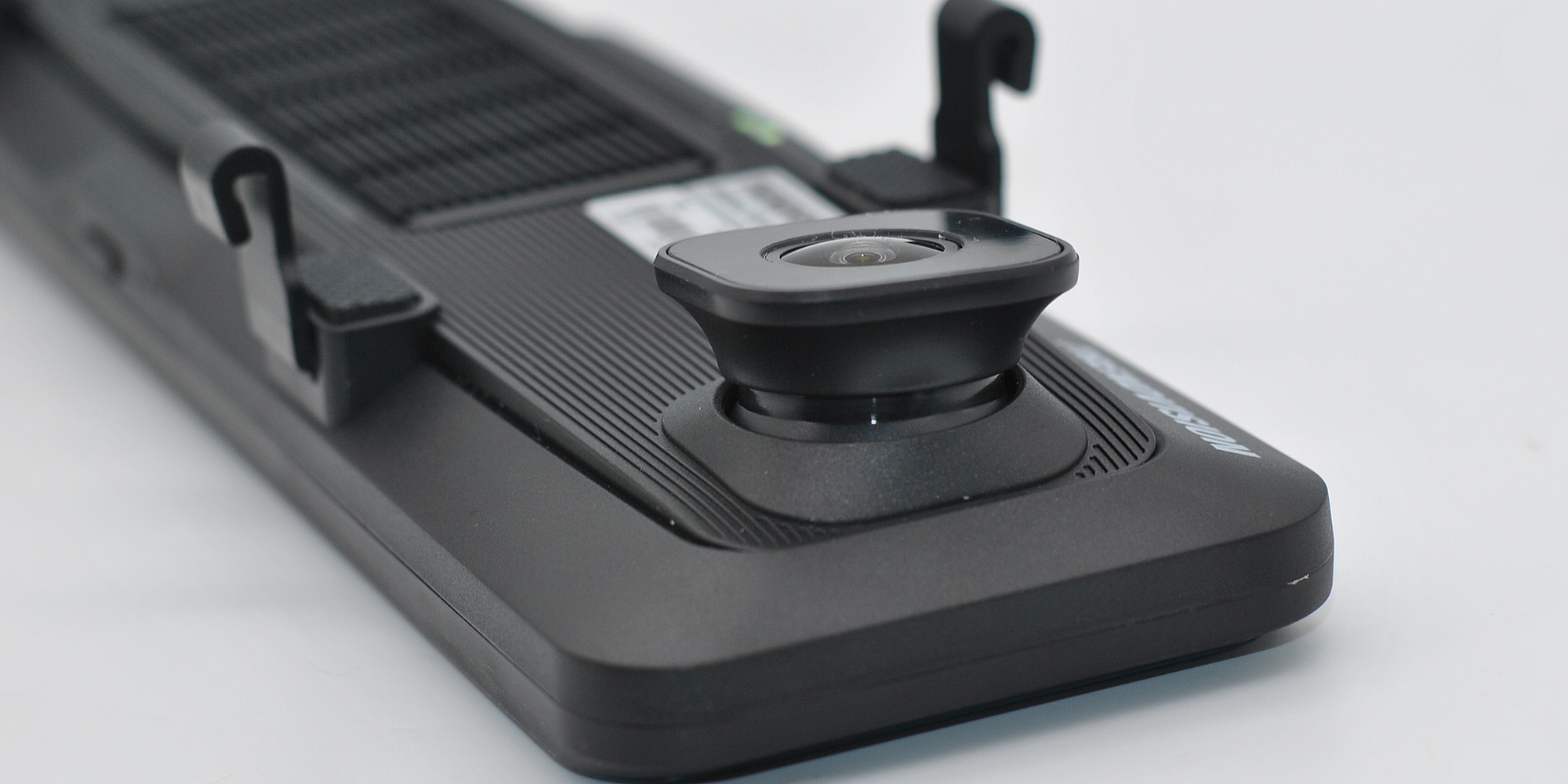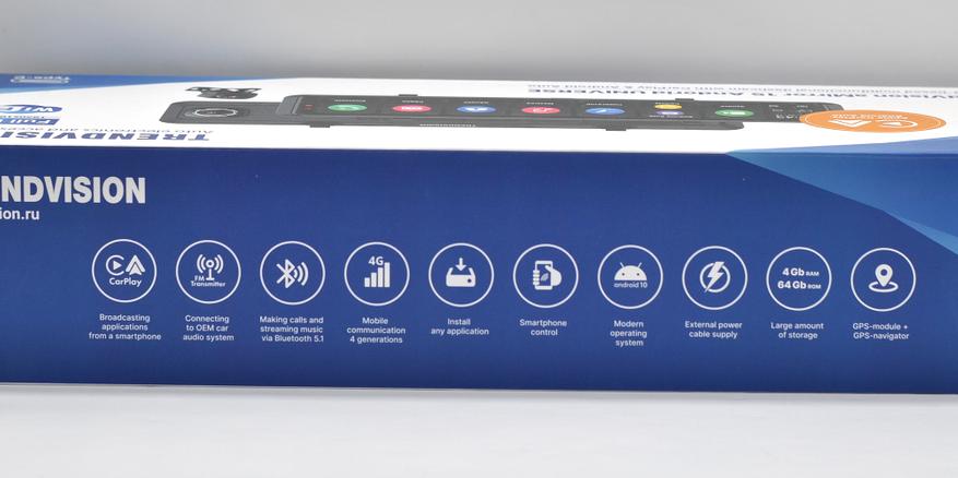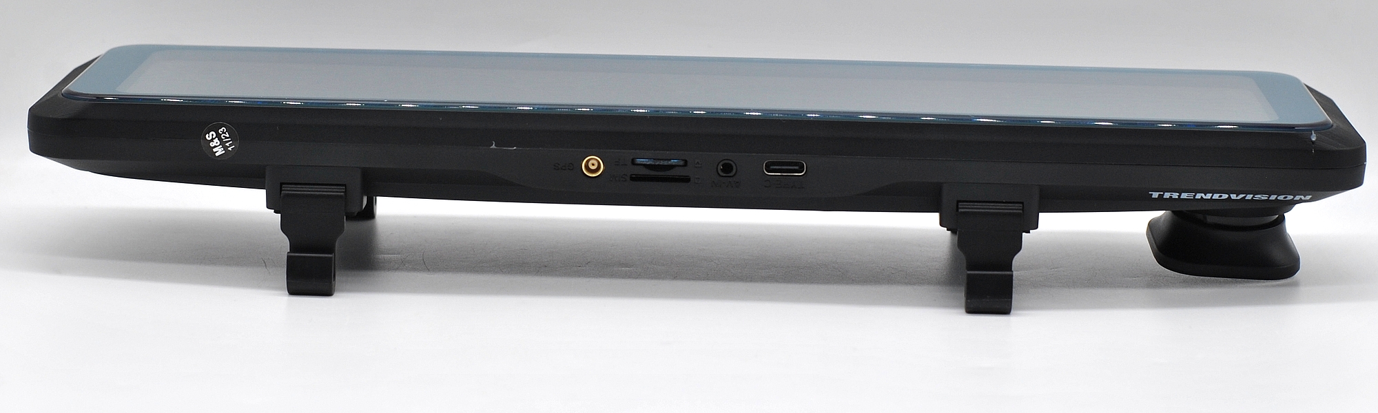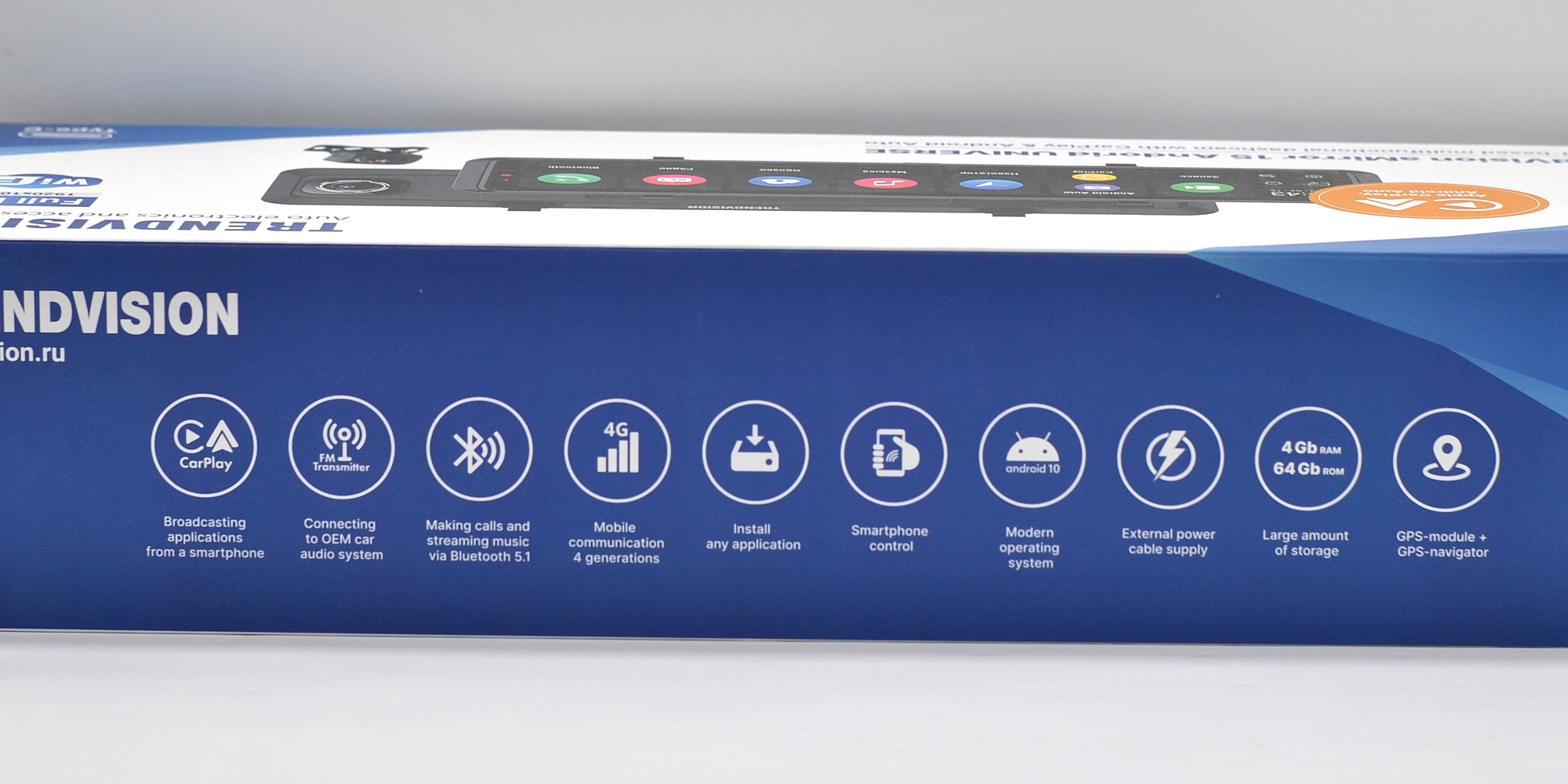 У модели типовая конструкция для такого форм-фактора, крепление идет к штатному зеркалу стяжками, само зеркало не повреждается из-за резиновых накладок. Передняя часть традиционно с зеркальным эффектом. Видимый размер экрана: 25х6 см. Объектив фронтальной камеры вынесен на поворотном в двух направлениях кронштейне.