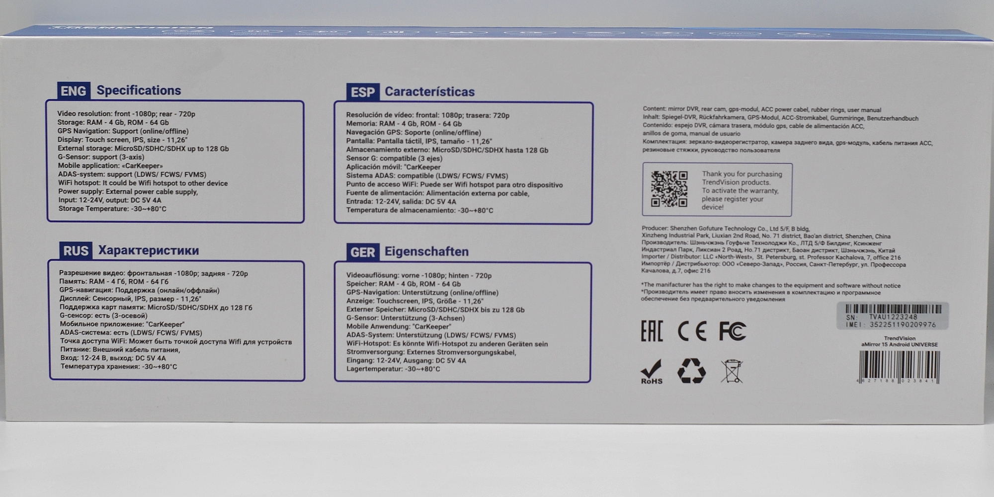 Модель aMirror 15 поставляется в коробке из плотного картона, она открывается на магнитиках. Оформление цветной полиграфии упаковки в духе продуктов от TrendVision. Характеристики указаны на разных языках, включая русский. Внутри поролоновая защита и картонная вставка, под которой размещена комплектация. Все красиво и надежно.