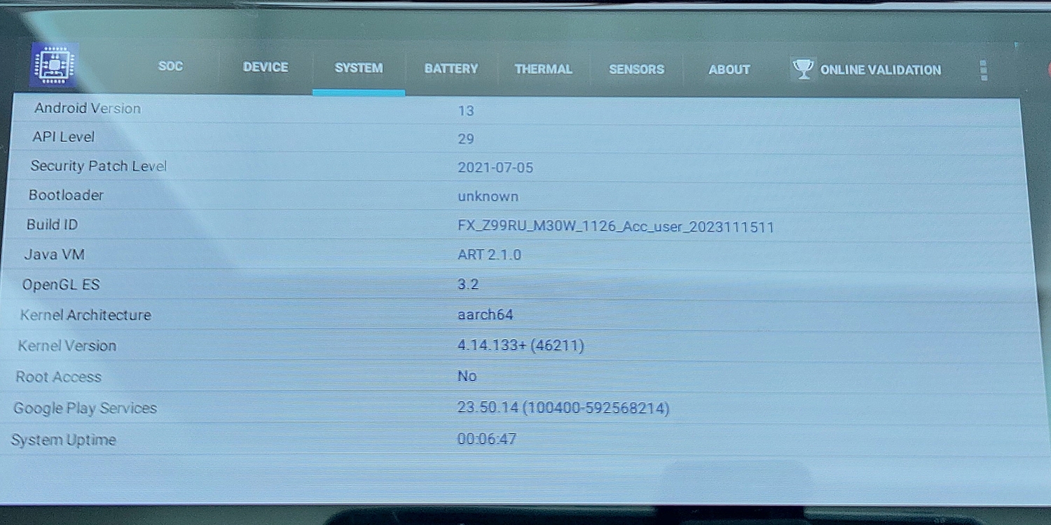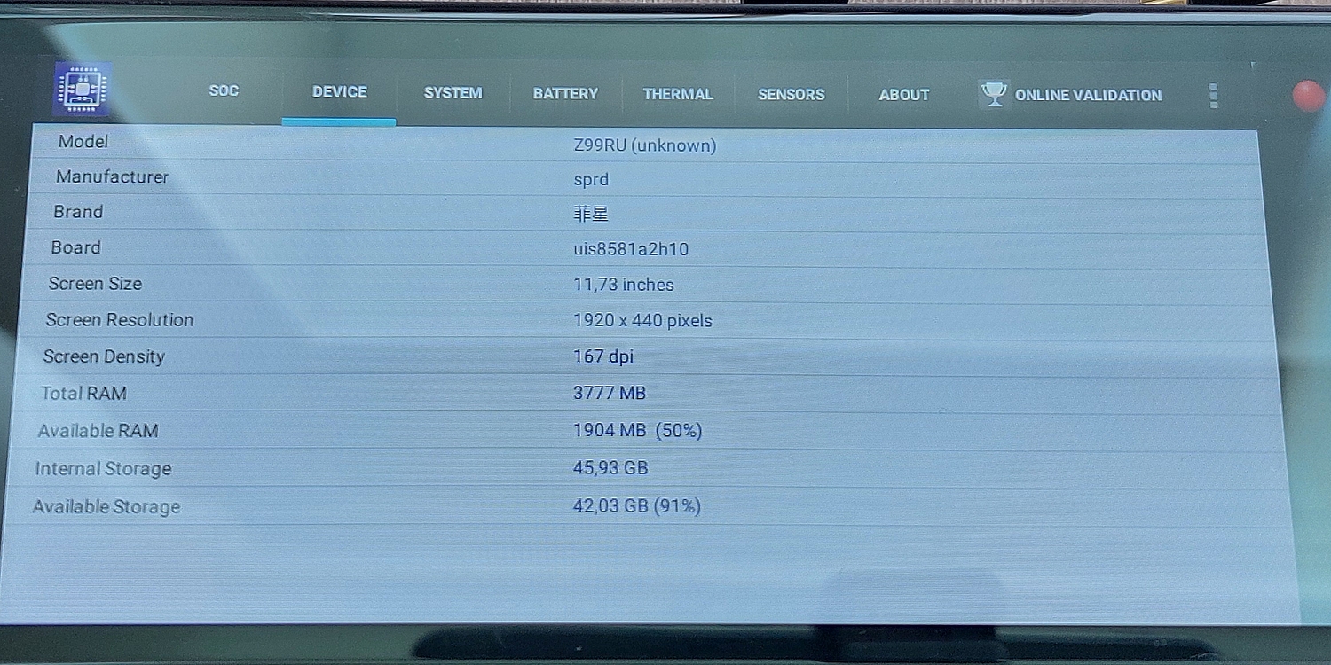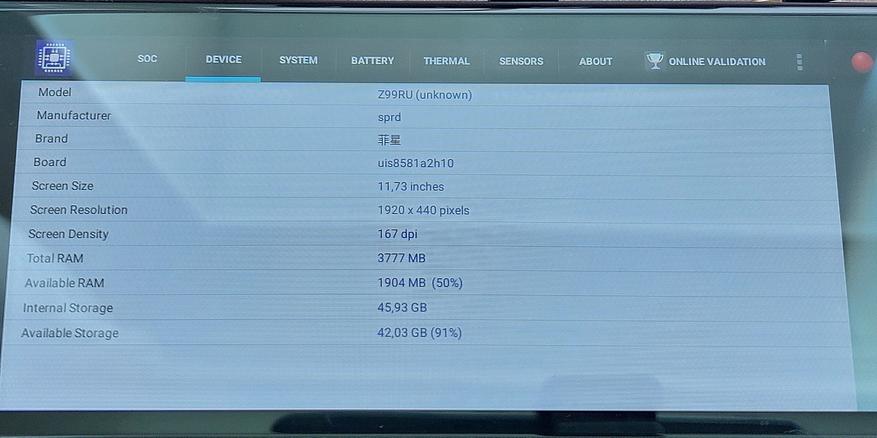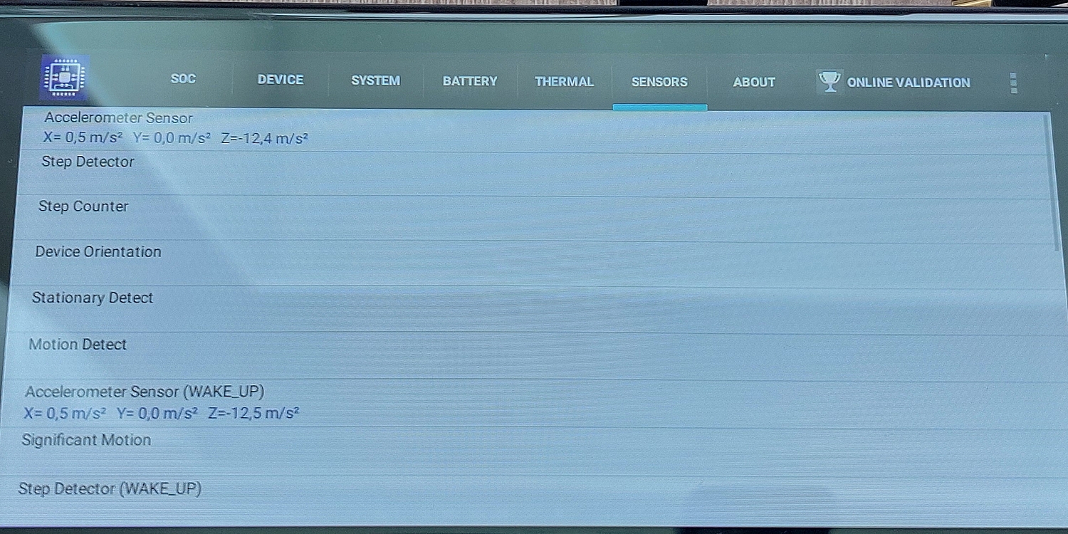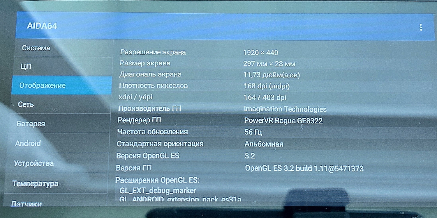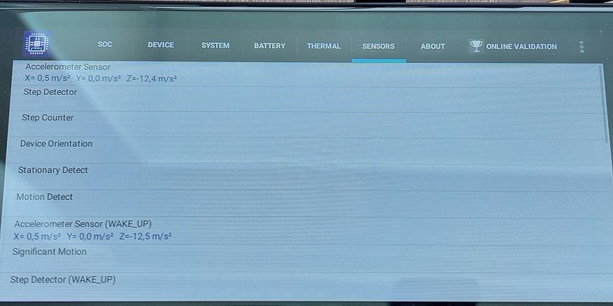 Видно, что установлен 8-мя ядерный ЦП ARM, GPU PowerVR GE8322 и 4/64 ГБ памяти. Есть трехосевой гироскоп.