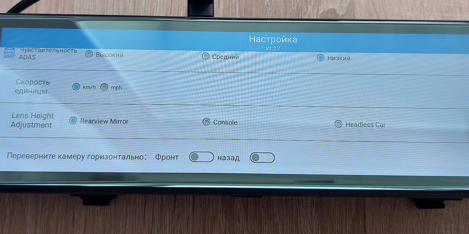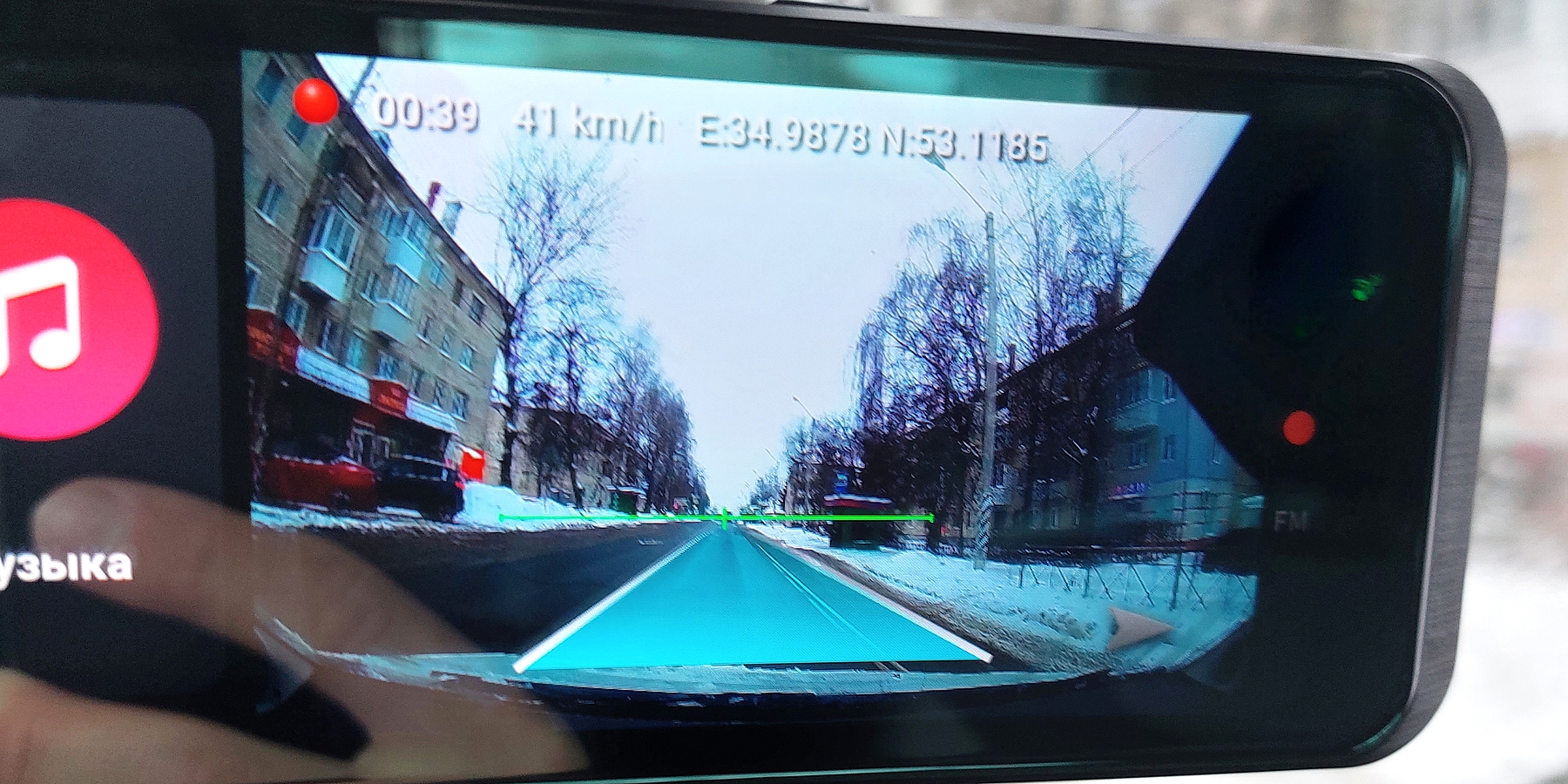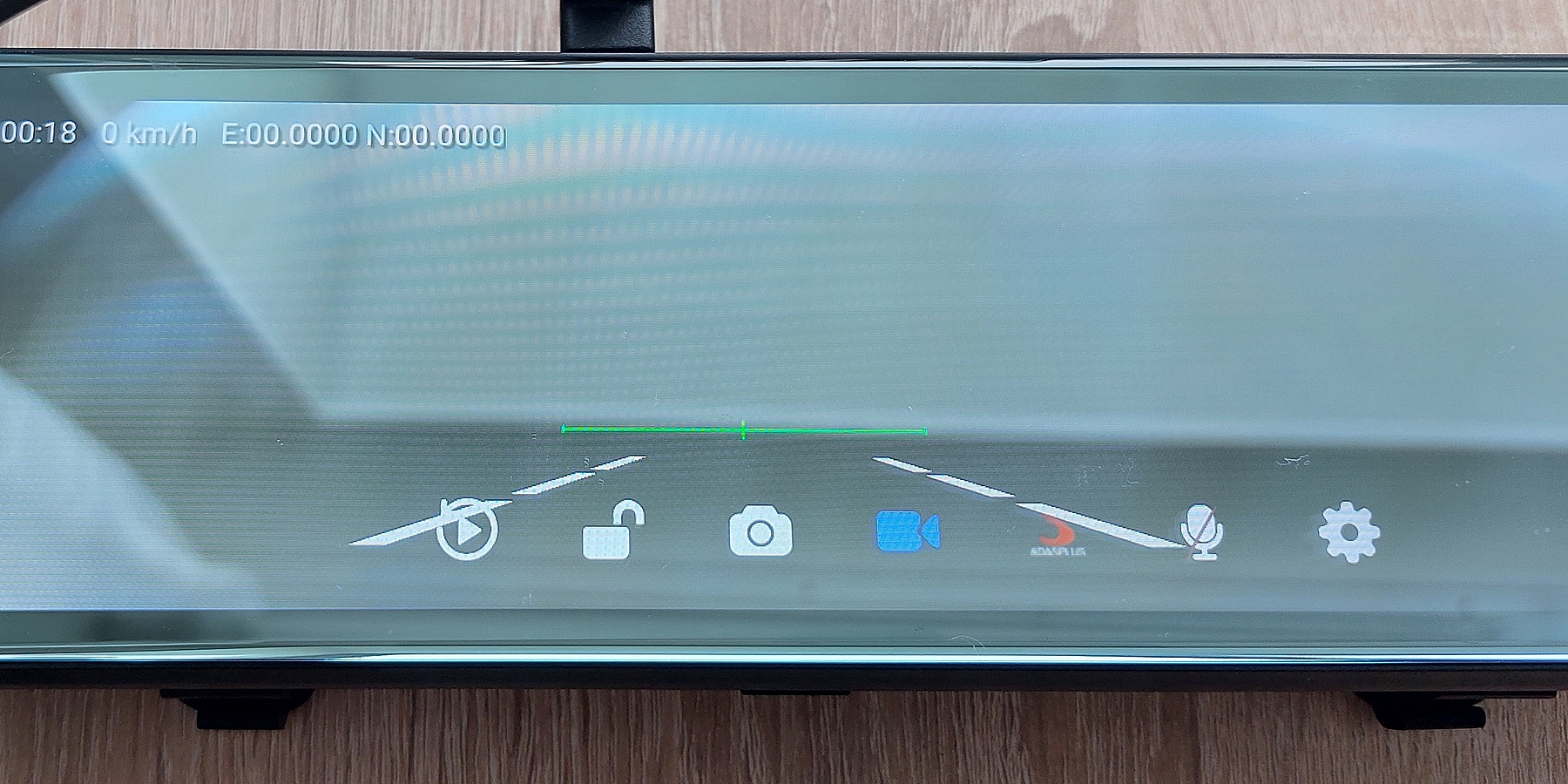 На экран можно выводить как меню, так и комбинации изображения с двух камер. При первой установке нужно выставить центр полосы и горизонт для работы системы ADAS. Значки меню крупные, удобно для сенсорного управления.