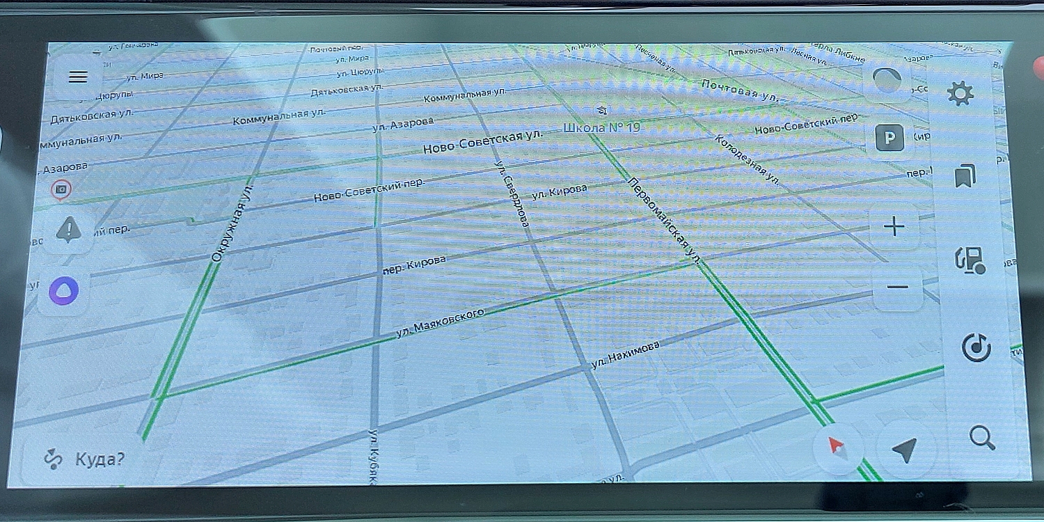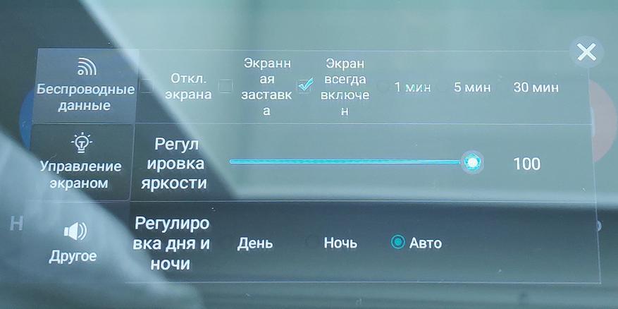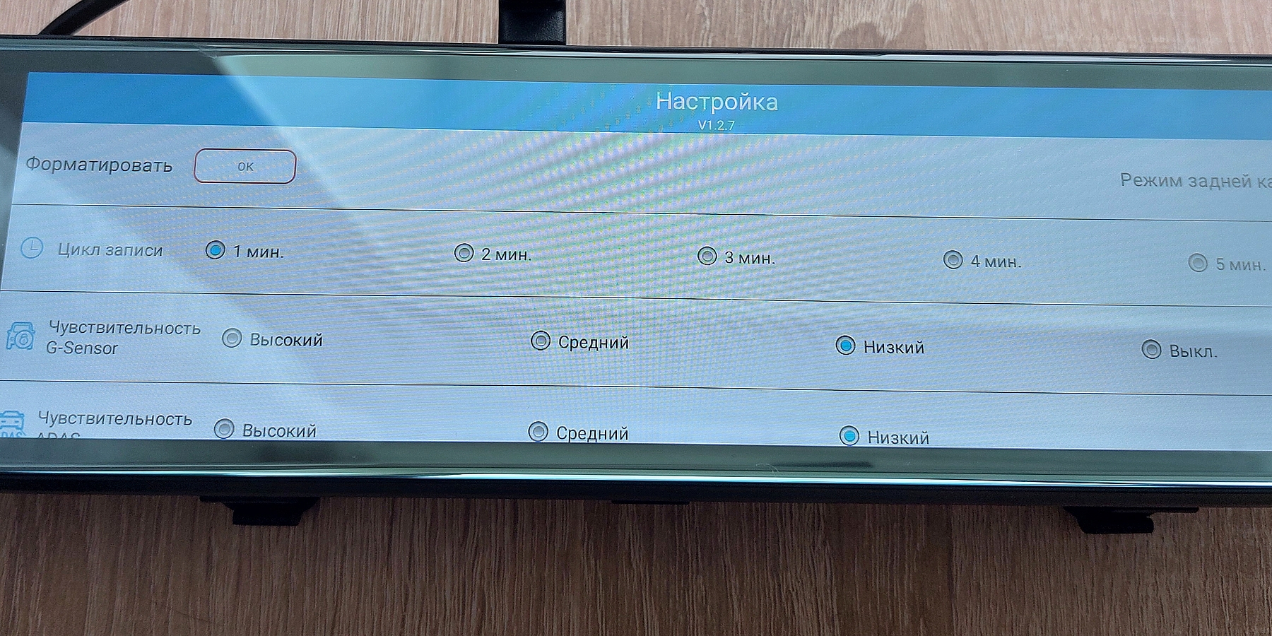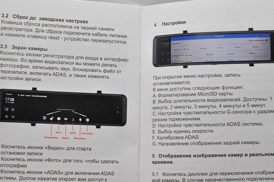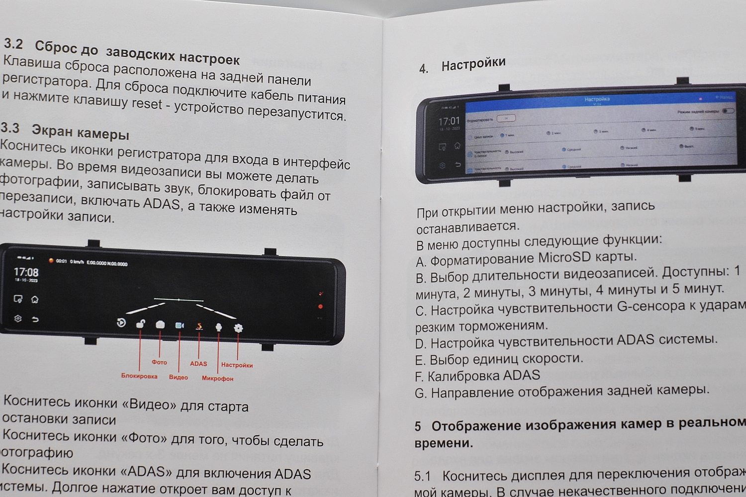 На экран можно выводить как меню, так и комбинации изображения с двух камер. При первой установке нужно выставить центр полосы и горизонт для работы системы ADAS. Значки меню крупные, удобно для сенсорного управления.