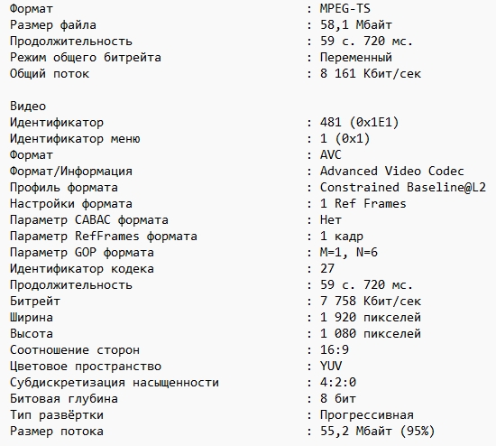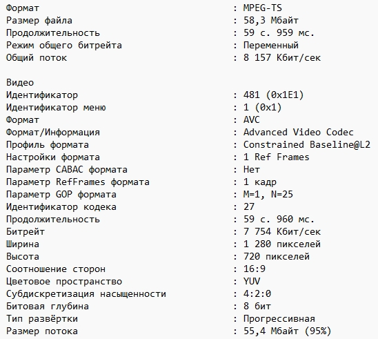 Параметры видеофайлов по версии ПО MediaInfo с двух камер: