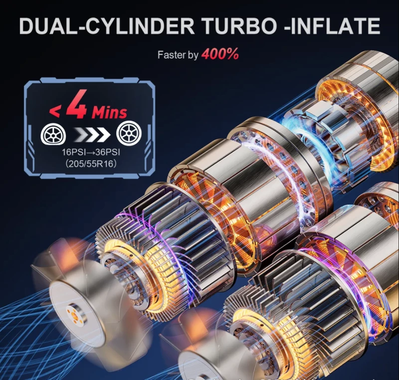 Компания GOOLOO выпустила новый портативный насос для шин GT160 DUAL, оснащенный инновационной двухцилиндровой системой мощностью 160 PSI. Устройство накачивает шины в четыре раза быстрее стандартных одноцилиндровых аналогов, заполняя шину Tesla Model 3/Y с 28 до 33 PSI всего за 52 секунды.