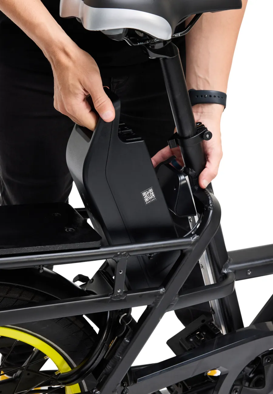 У модели есть ряд ключевых инноваций. Две батареи емкостью 700 Вт*ч с возможностью горячей замены обеспечивают запас хода на 140 км (87 миль), что практически исключает необходимость подзарядки в середине смены и позволяет водителям дольше находиться в дороге. Задний двигатель имеет 250 Вт мощности для Европы/500 Вт для США и момент вращения 45 Н*м. Имеется 5 уровней поддержки привода и режим «дроссельной заслонки». Зарядное комплектное устройство 3/4 А заряжает батарею за 3-4 часа.