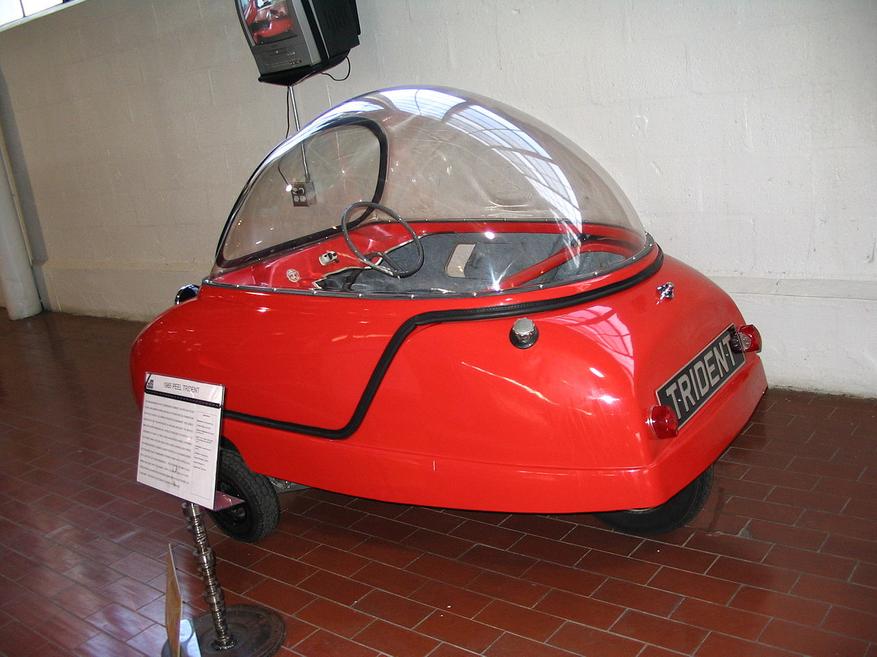 Успех P50 — а компания продала аж 47 экземпляров за три года производства! — вдохновил Peel Engineering на создание «семейной» версии. Так появился Trident — микрокар с футуристическим прозрачным куполом вместо крыши, напоминающим летающую тарелку.