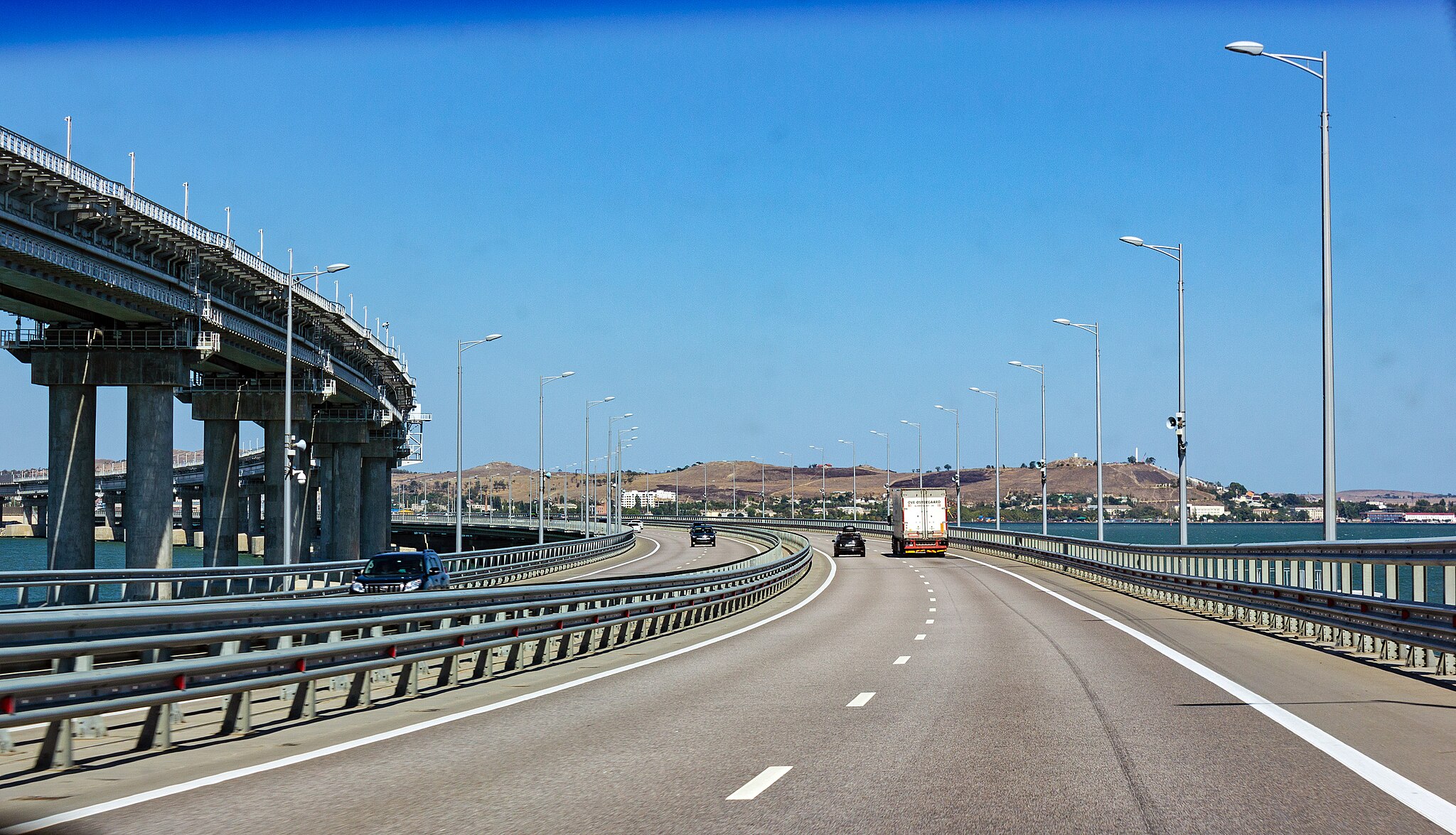 Что касается скоростного режима, то на подъездах к пунктам досмотра и постам ДПС он ограничен 30 км/ч. На самом мосту разрешено двигаться со скоростью 90 км/ч.
