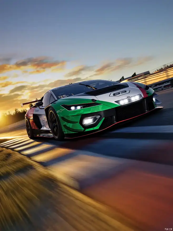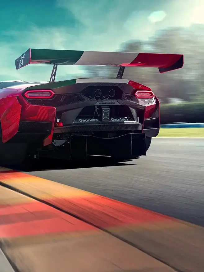 Задняя часть гоночного Lamborghini характеризуется наличием крупного фиксированного антикрыла и увеличенного диффузора, что обеспечивает необходимую прижимную силу на высоких скоростях.