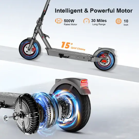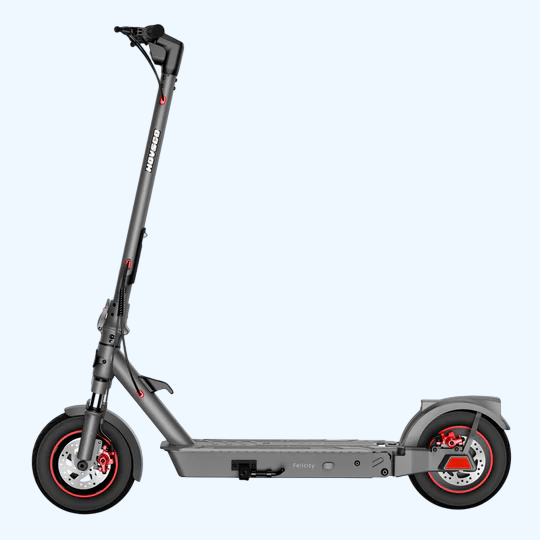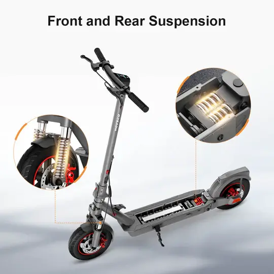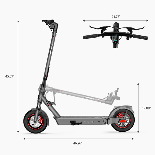 Скутер оснащен аккумулятором емкостью 36 В и емкостью 10,4 А*ч. Для складывания самоката для переноски или его перемещения требуется выполнить всего два действия. Подпружиненная подставка для ног расположена с левой стороны и легко выдвигается и убирается обратно. Она фиксирует скутер, когда он не используется. Размер колес, на которых катится скутер — 10 дюймов. Интегрированная система передней и задней подвески уменьшает ощущение неровностей на дороге.