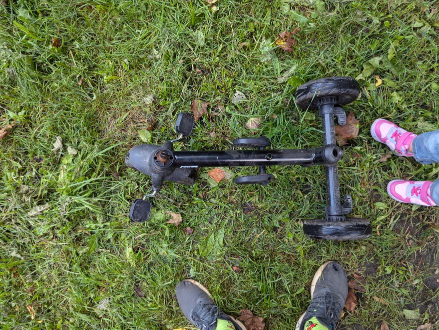 При взрослении ребёнка ручка станет не нужна, но что делать с местом её крепления — загадка. Если убрать ручку, будет зиять большая дыра, в которую легко попадёт дождь, из-за чего рулевой механизм может заржаветь и заклинить. Не очень приятно.