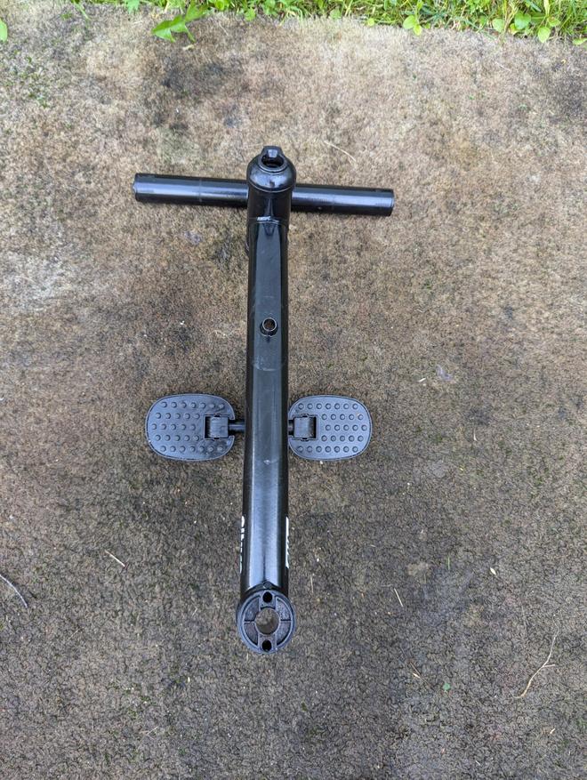 Чтобы перевозить ребёнка, когда он устал, или если дитя пока ещё не дотягивается до педалей, есть ручка для взрослых. Эта ручка выполняет две функции — простая ручка для толкания велосипеда и руль. Если честно, это один из самых неудобных элементов во всём велосипеде.