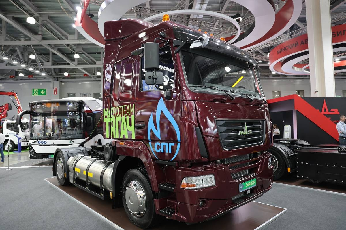 На международной выставке коммерческого транспорта COMVEX, проходившей в Подмосковье, белорусский автопроизводитель МАЗ презентовал новейший седельный тягач МАЗ-54А02N, работающий на сжиженном природном газе (СПГ). Эта модель специально разработана с учетом требований по безопасной транспортировке опасных веществ.