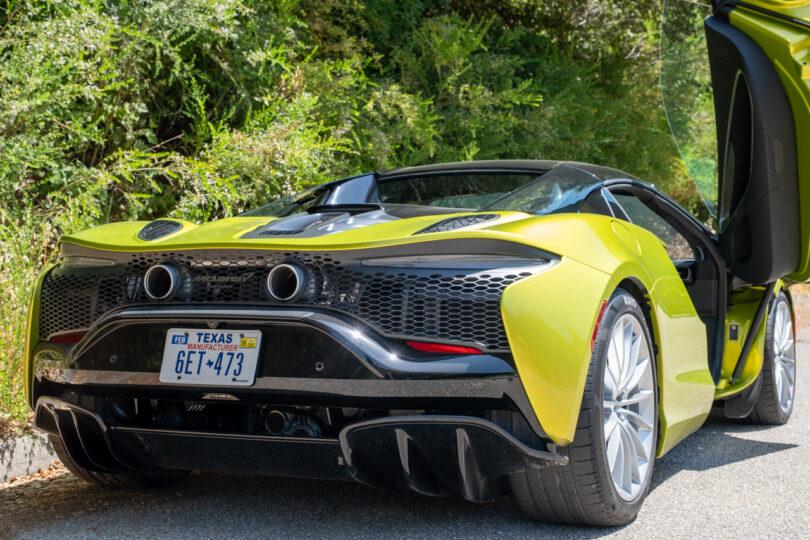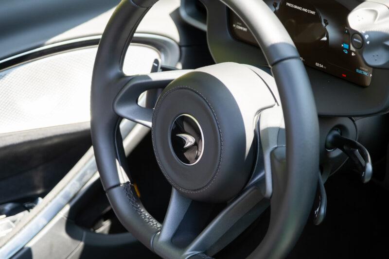 Внешний дизайн автомобиля сохраняет фирменный стиль McLaren с элементами из углеродного волокна и рельефными алюминиевыми панелями. Характерные двери-бабочки обеспечивают доступ в минималистичный салон, ориентированный на производительность.
