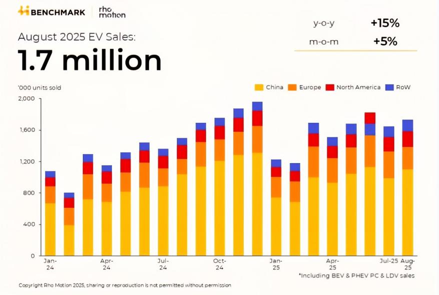 Мировые продажи электромобилей достигли 1,7 млн единиц в августе 2025 года