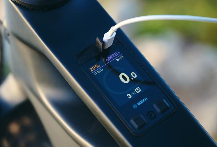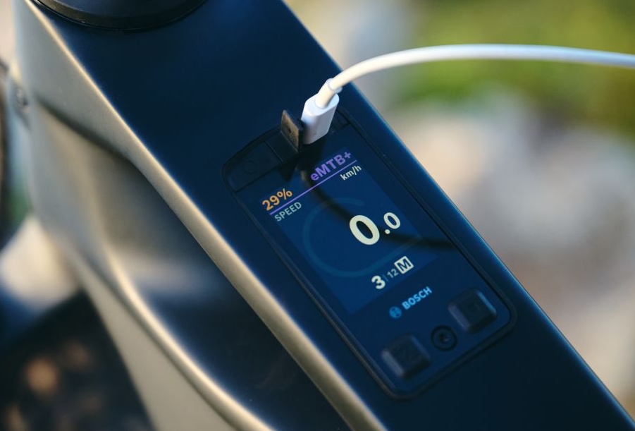 Обновился и экран контроллера это центрального электромотора — Kiox 400C. Там встроена автоматическая регулировка яркости, и динамически выводятся дополнительные параметры поездки, а установка теперь проходит заподлицо в верхнюю трубу рамы, а не на руль велосипеда. Для зарядки гаджетов от АКБ электровелосипеда есть порт USB-C.