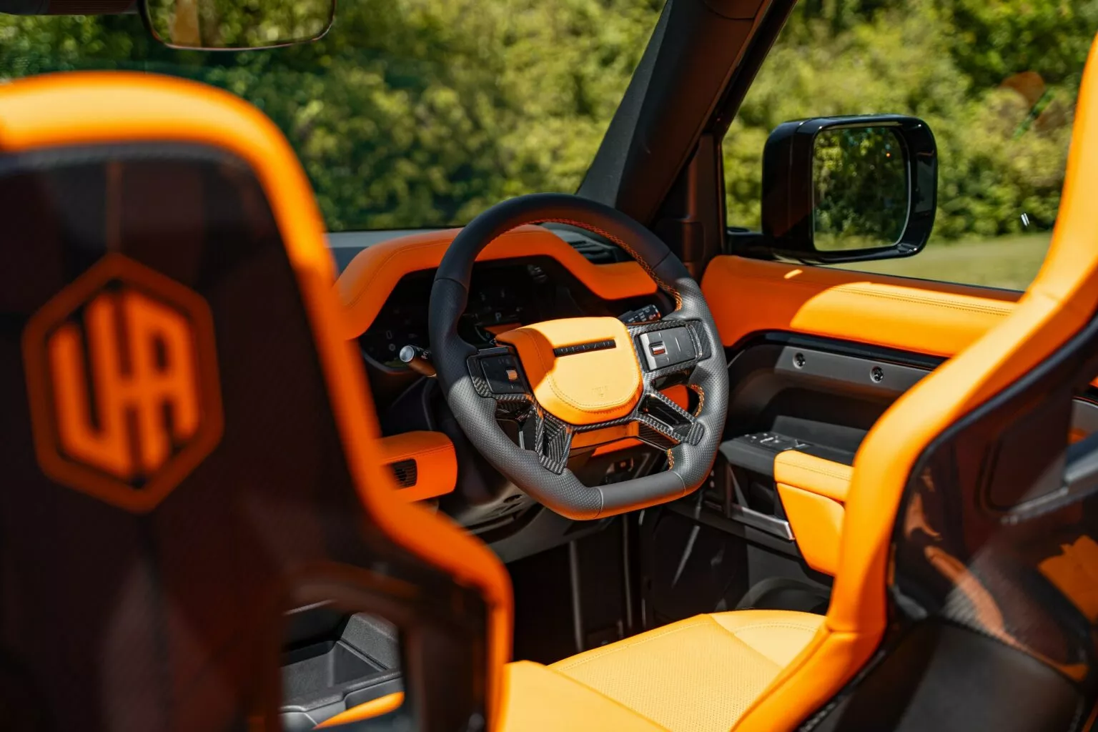 Автомобиль также получил вентилируемый капот, новые светодиодные дневные ходовые огни, карбоновые корпуса боковых зеркал и 23-дюймовые колесные диски Urban WX-2 R с шинами Yokohama Advan Sport. Над задними сиденьями установлены две дуги безопасности.