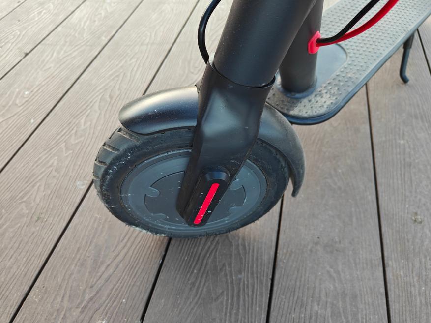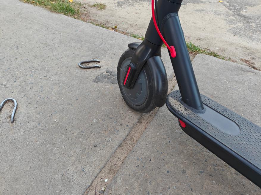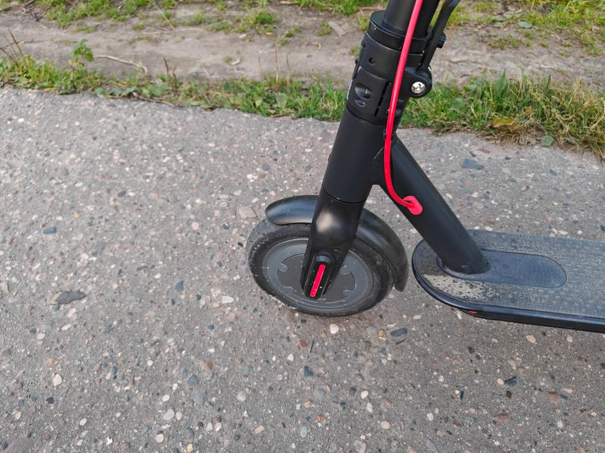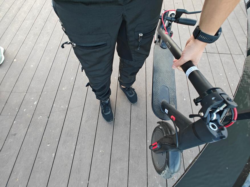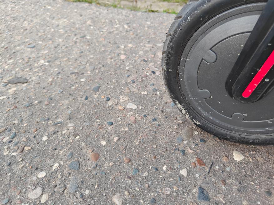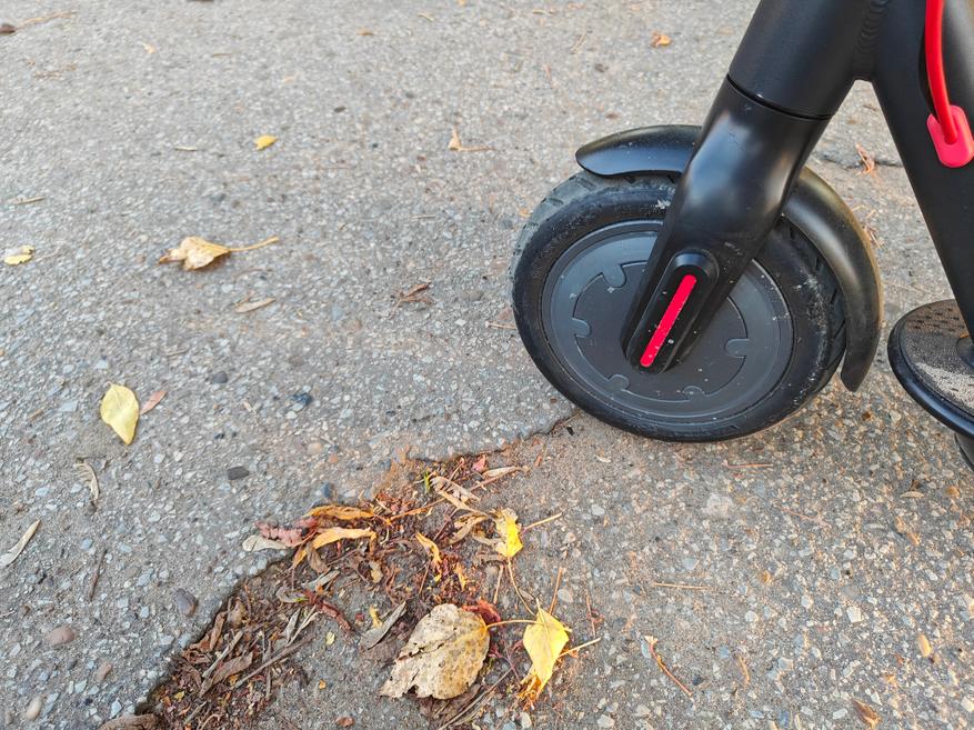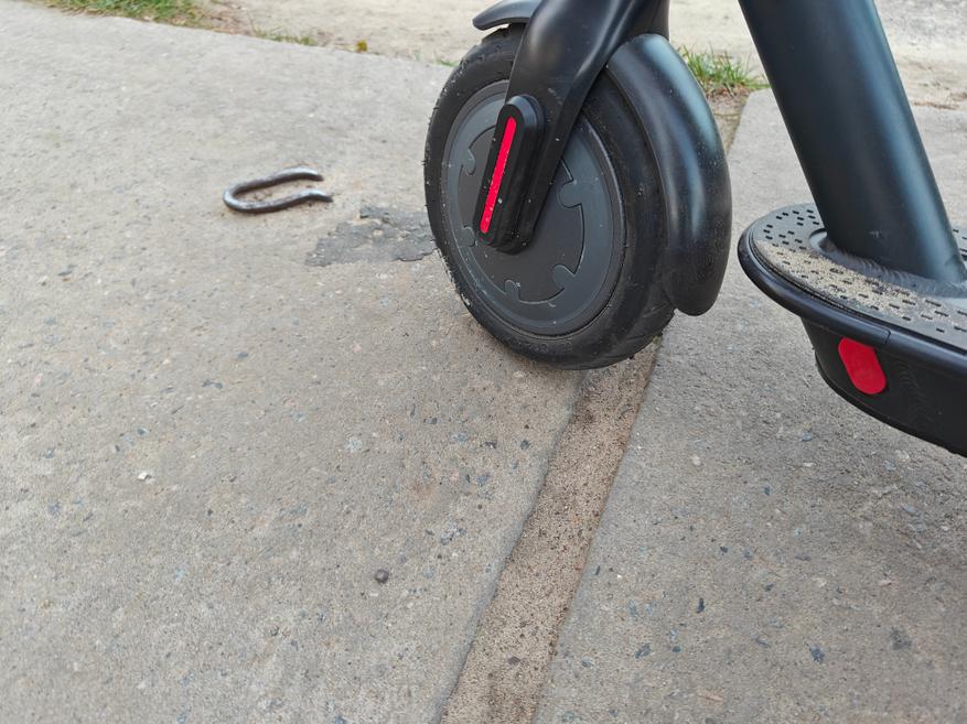 Самокат способен ехать в режиме D порядка 25 километров с ездоком весом 80 кг. А заряжается около 5,5 часов. Мне понравилась, как отрабатывают колеса самоката, он просто проглатывает неровности, хотя активной подвески у него нет. Он едет по выбитому асфальту, не чувствуются трещины в покрытии, можно пролетать стыки плит без бряцания аккумулятором. Вот такие нервности самокату не страшны.