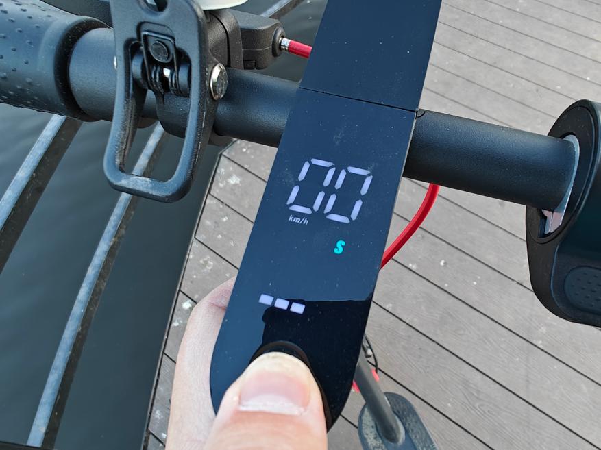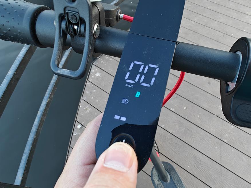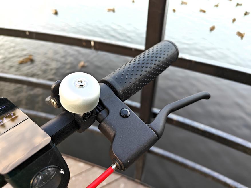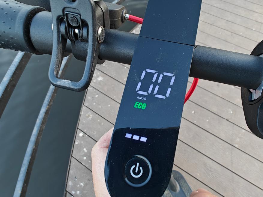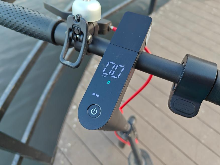 Справа гашетка газа, слева дисковый тормоз заднего колеса и звонок. В принципе все привычно. На руле же встроен цветной дисплей, который отображает скорость, выбранный режим перемещения, заряд батареи и горит ли фара. Активируется он всего лишь одной единственной кнопкой.