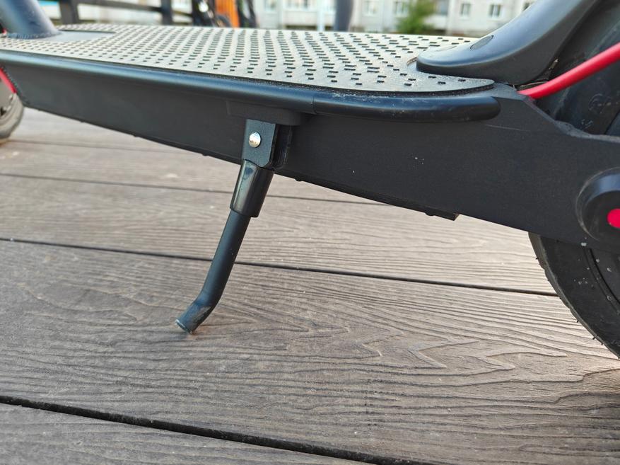 За торможение отвечает полноценный дисковый тормоз и электрический тормоз двигателем. Исполнение тормозной системы на 5-ку. Настроены тормоза из коробки отлично. Ничего не цепляет и не шумит и хватает диск качественно. Вертикально самокат удерживает металлическая мощная подножка, которая, разумеется, складывается вдоль корпуса. Делать это удобно одной ногой.