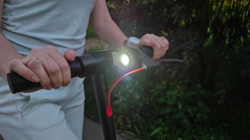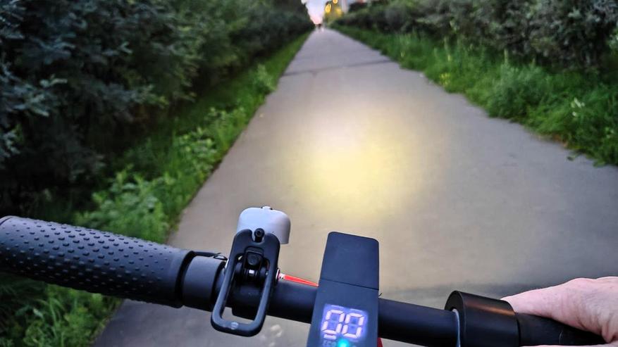 Если зафиксировать ручку газа в одном положение и ехать равномерно какое-то время включается круиз-контроль с характерным писком и можно будет ехать и не давить на газ. Очень удобно. Фара яркая, не слепит встречных и достаточна для поездки в полной темноте. При нажатии на тормоз — активируется моргание стоп-сигнала.