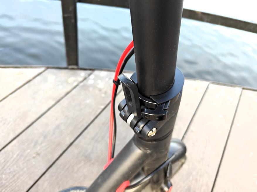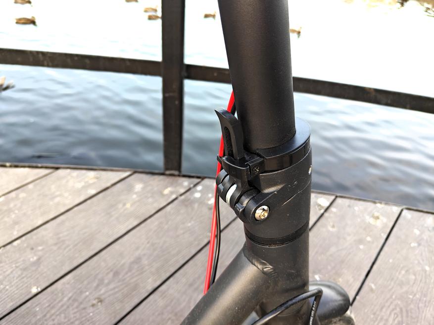 Самокат поставляется в сложенном виде. Просто поднимаем стойку руля вертикально до предела и зажимаем металлическим рычагом. Дополнительно рычаг снабжен пластиковым фиксатором, который поворачивается по оси стойки. Компоненты сборки качественные, все движения проводятся с заметным усилием. Никакого люфта или биения в этом узле нет.