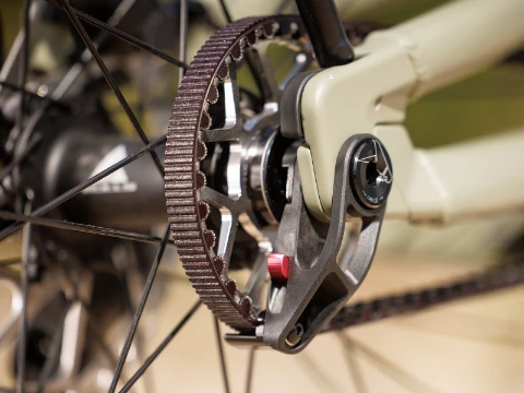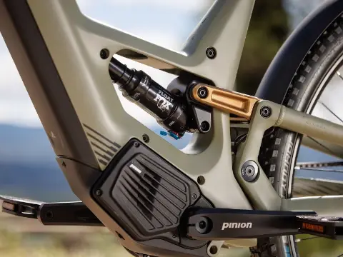Герметичный моторный блок Pinion MGU объединяет в себе 250-ваттный двигатель с крутящим моментом 85 Нм и 12-скоростную планетарную трансмиссию с функцией автоматического переключения передач в одном корпусе. В качестве привода используется карбоновый ремень Gates CDX. Такая комбинация повышает надежность велосипеда и снижает уровень шума. Рама из алюминиевого сплава скрывает в своих недрах задний амортизатор Fox Float PS с ходом 120 мм. Спереди установлена амортизационная вилка Fox Float 34 AWL с аналогичным ходом 120 мм. Велосипед питается от встроенного в раму аккумулятора емкостью 800 Втч.