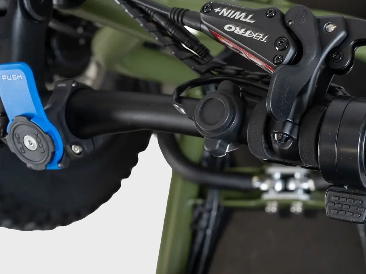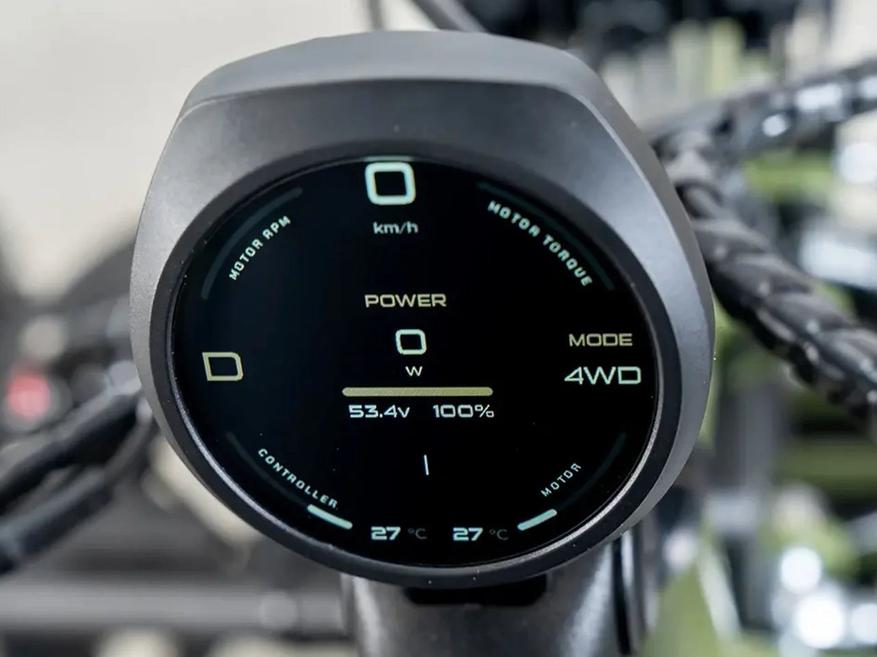 Вездеход оборудован усиленными шинами с крупным протектором и защитой боковин от проколов. Тормозная система включает Т-образные раздельные тормоза Tektro и ручной тормоз для остановки на склонах. Двойные светодиодные фары обеспечивают освещение в темное время суток.