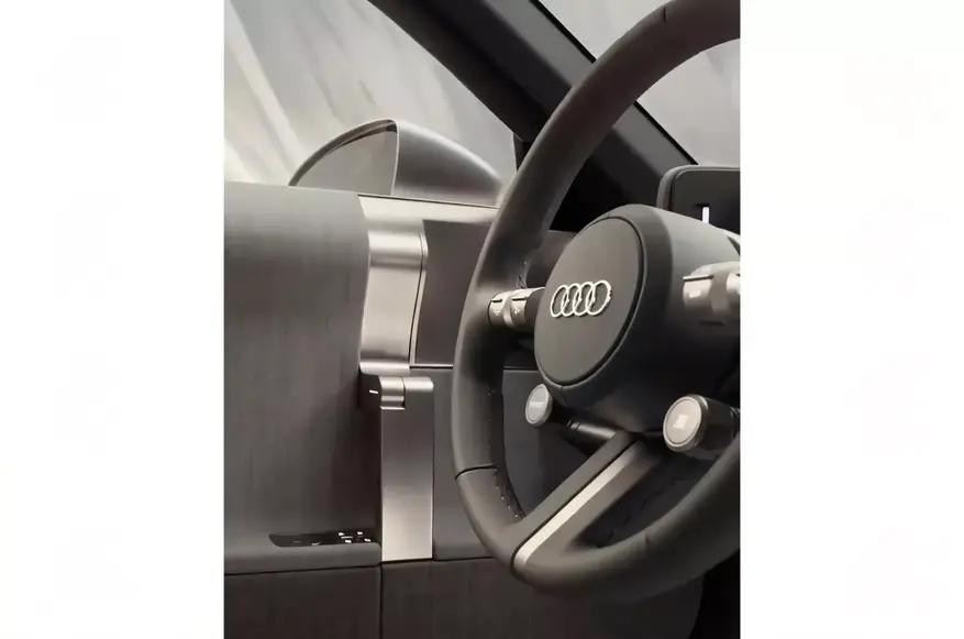 Передняя часть автомобиля оснащена модифицированной для электромобиля прямоугольной решеткой радиатора с фирменным четырехкольцевым логотипом на черном фоне. Интерьер содержит отсылки к оригинальному TT, включая классическое спортивное рулевое колесо, алюминиевую отделку и комбинацию поворотных переключателей с физическими кнопками.