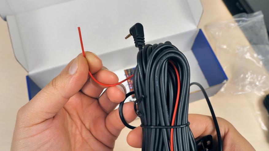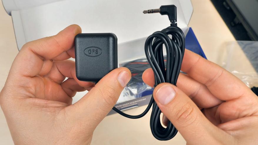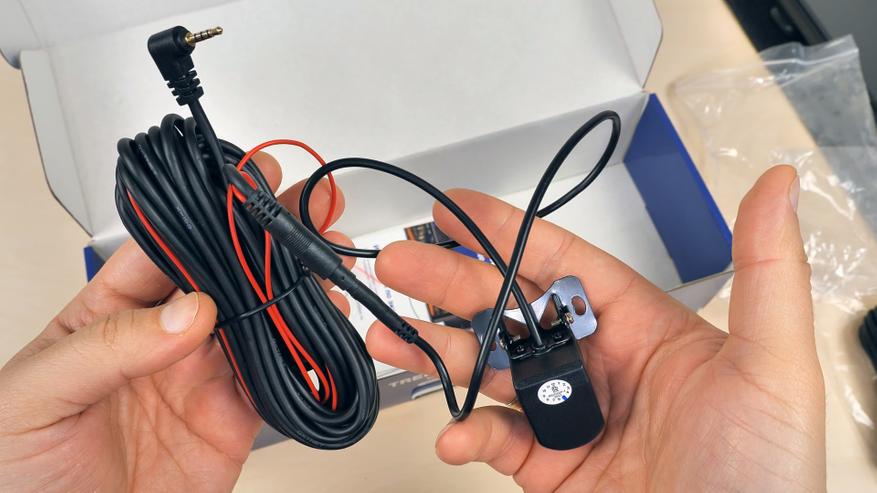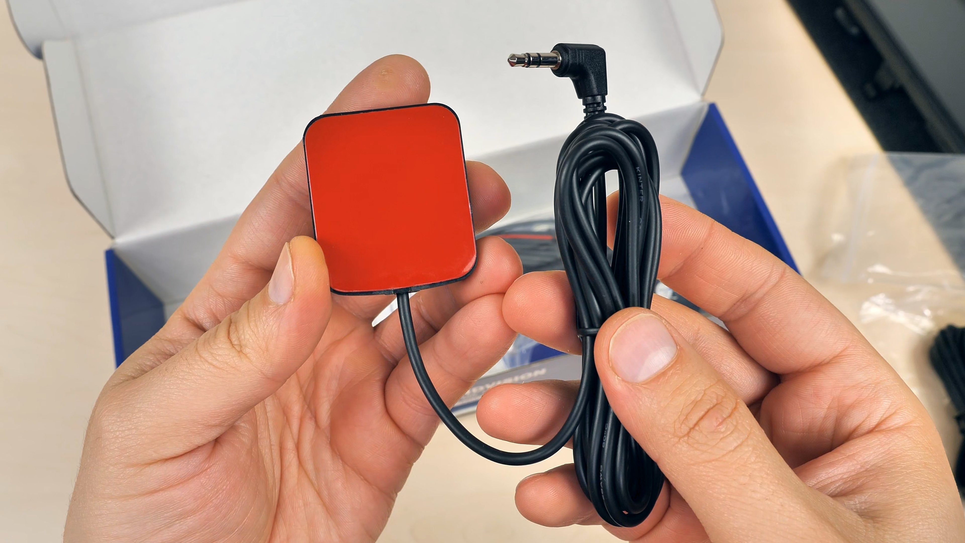 Есть в комплекте выносная GPS антенна, при помощи которой зеркало определяет координаты и скорость автомобиля. Антенна выносная, монтируется на двухсторонний скотч, её можно установить в оптимальном месте, например, на лобовом стекле для более уверенного приёма сигнала спутников. Есть в комплекте и задняя внешняя камера, она имеет длинный шестиметровый кабель, а также красный сигнальный провод для подключения, например, к лампе заднего хода, чтобы зеркало понимало когда включена задняя передача и выводила на экран картинку с задней камеры.