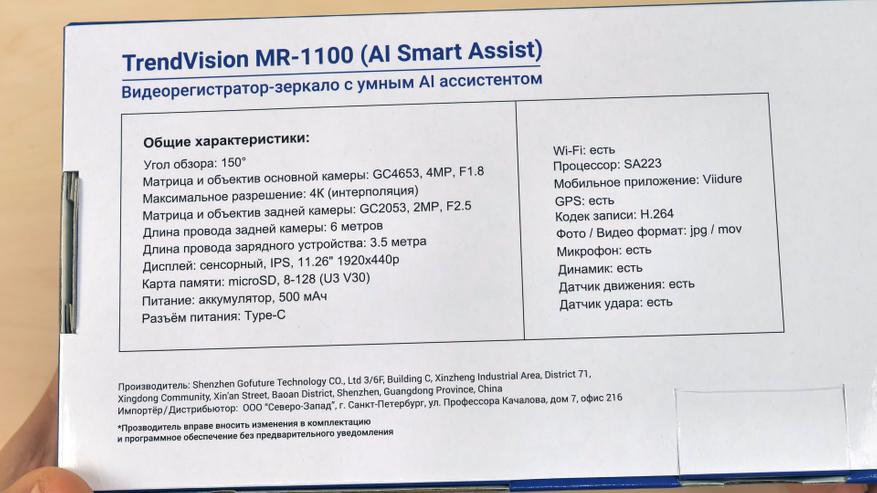 MR-1100 (AI Smart Assist) — это автомобильное зеркало-регистратор от отечественного бренда Trendvision. Оно имеет большой и яркий дисплей диагональю более 11 дюймов, разрешение съёмки 4K с основной передней камеры, а также имеет дополнительную внешнюю заднюю камеру для фиксации дорожной обстановки позади автомобиля.